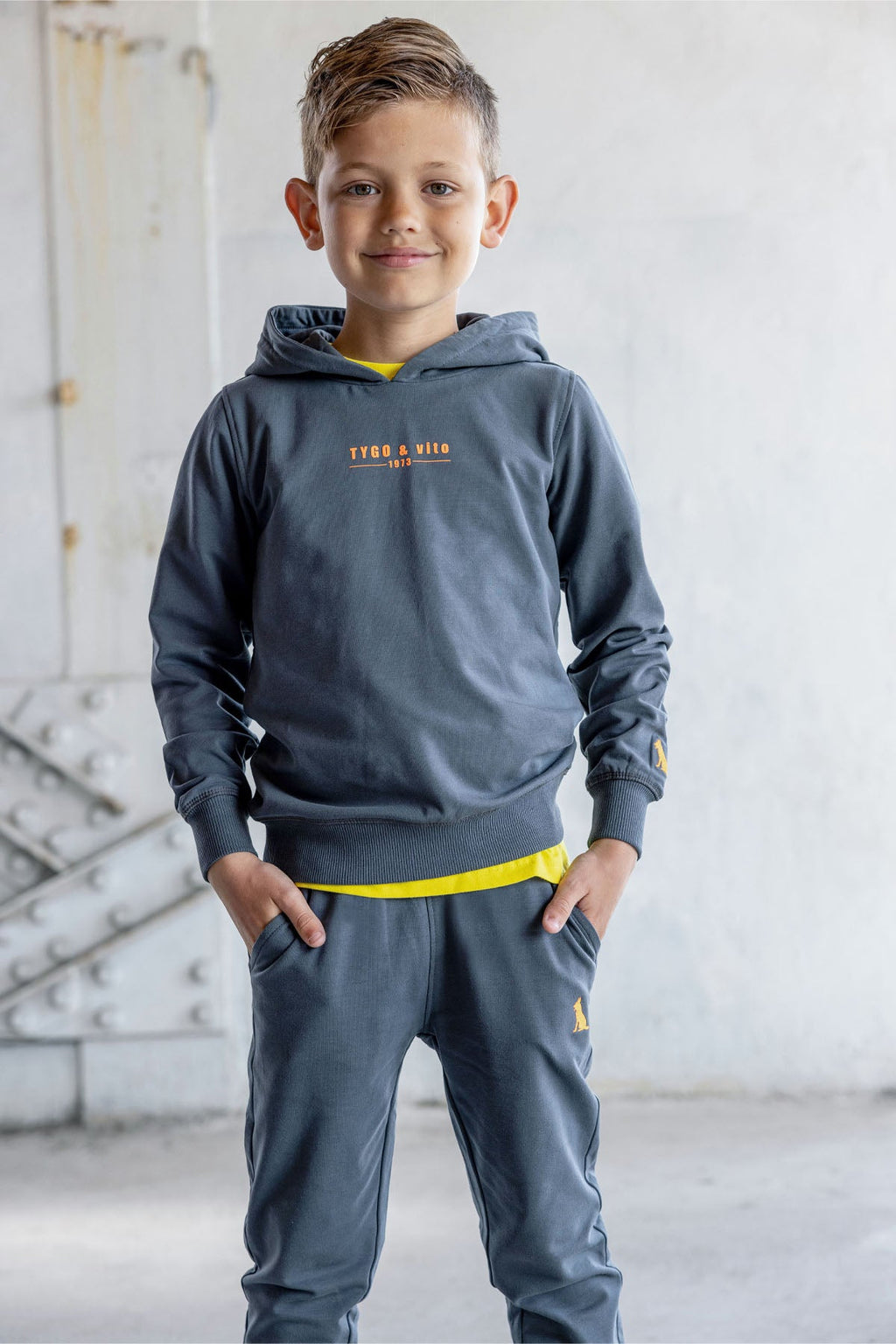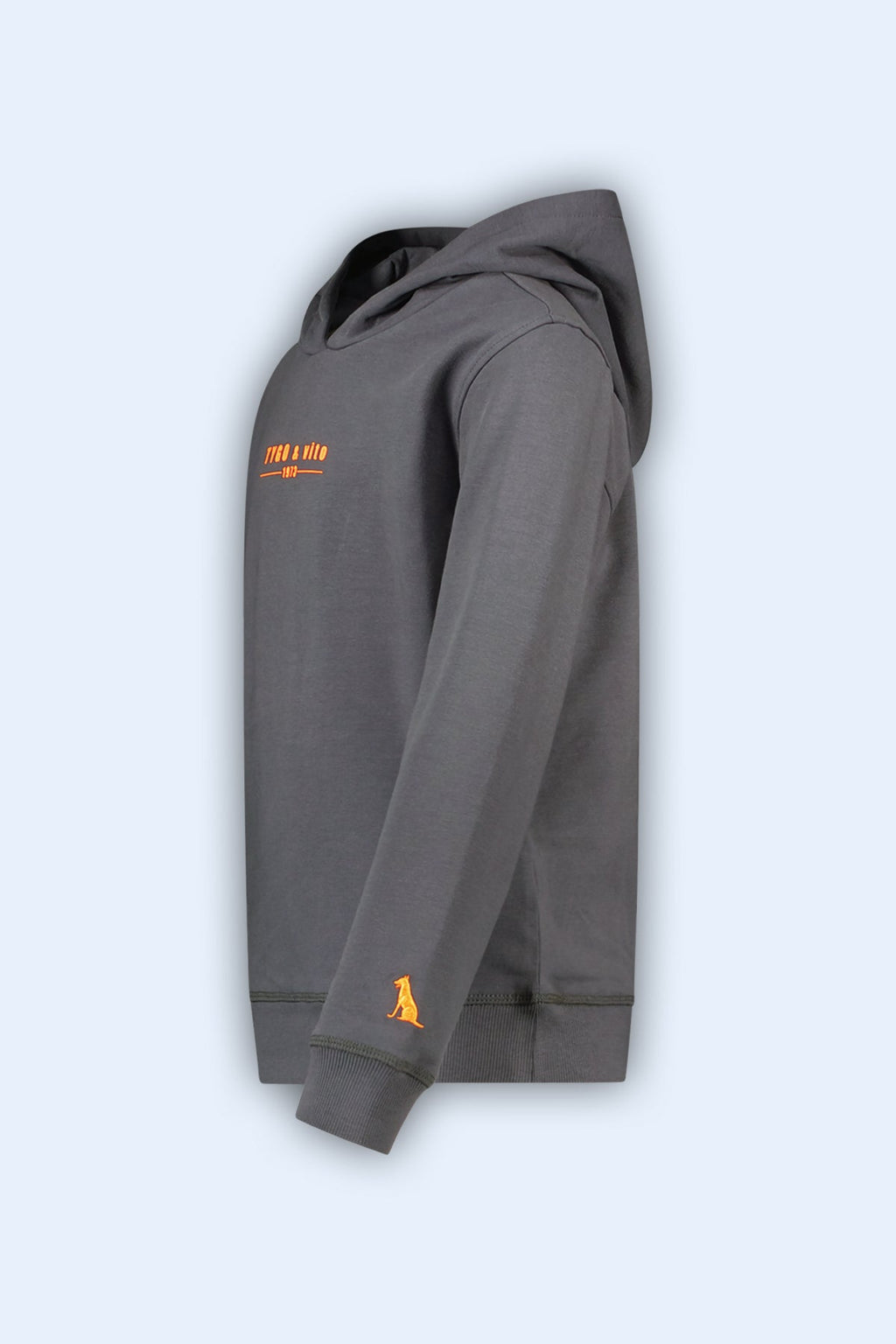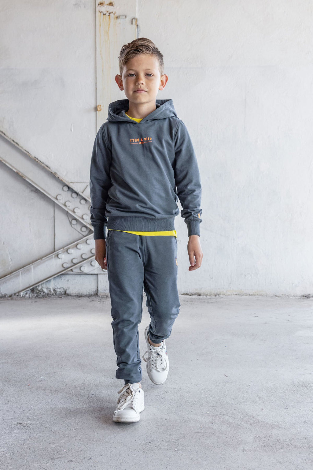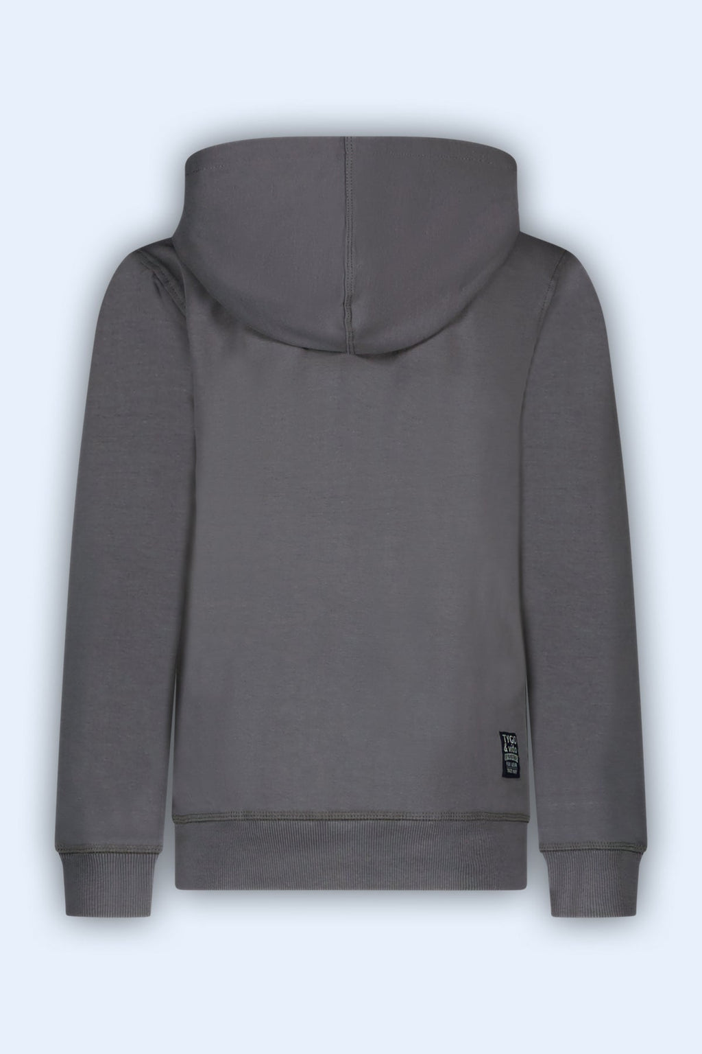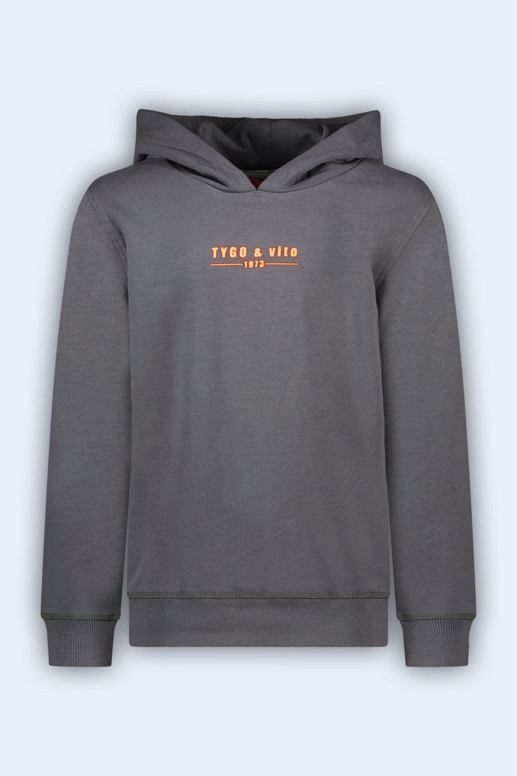 Sportieve grijze hoodie 'Hugo' in biologisch stretch katoen met een logoprintje op de borst en TYGO borduurtje op de mouw. Combinatietip: Draag deze capuchon sweater op jogpant 'Boaz'. TYGO & vito gebruikt graag biologisch katoen, omdat het is geteeld zonder gebruik van chemische bestrijdingsmiddelen. Dat is beter voor het milieu én beter voor de telers. TYGO & vito FOR A BETTER NEXTERDAY. Wist je trouwens dat je door het scannen van de QR code de reis kunt zien die dit kledingstuk al heeft afgelegd? Verkrijgbaar in de maten 92-152.