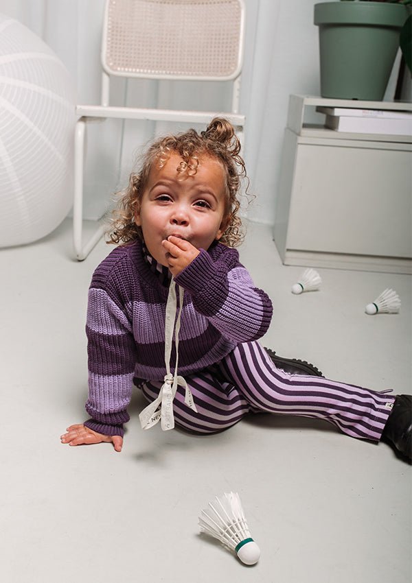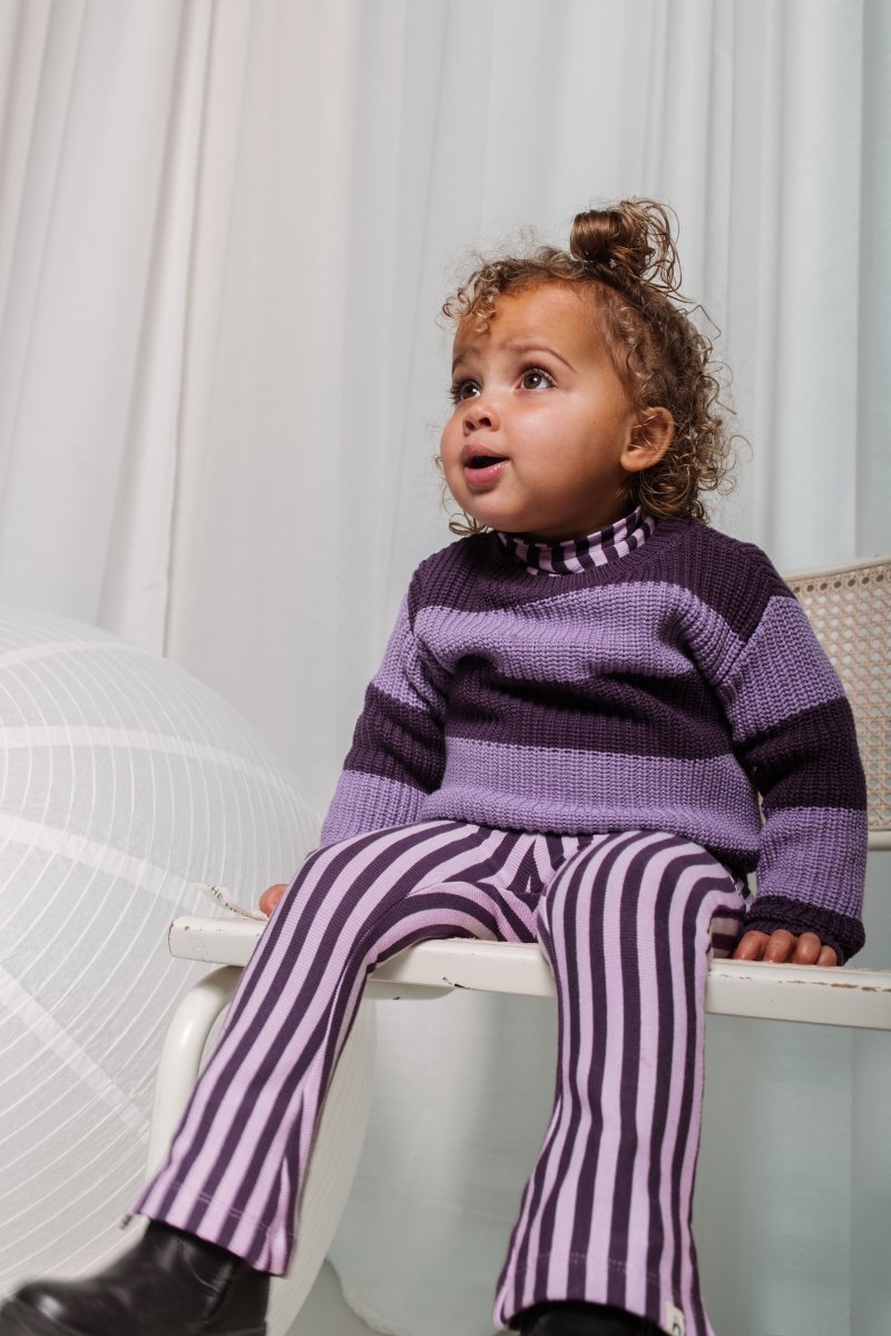 Meet Jamie! Onze tijdloze super fijne knitted sweater! Dit gestreept paars met lila truitje is heerlijk als het wat frisser is. Koop hem een maatje groter en draag hem heerlijk oversized, een paar keer omrollen en je hebt super toffe look toch? Gemaakt van duurzaam katoen!