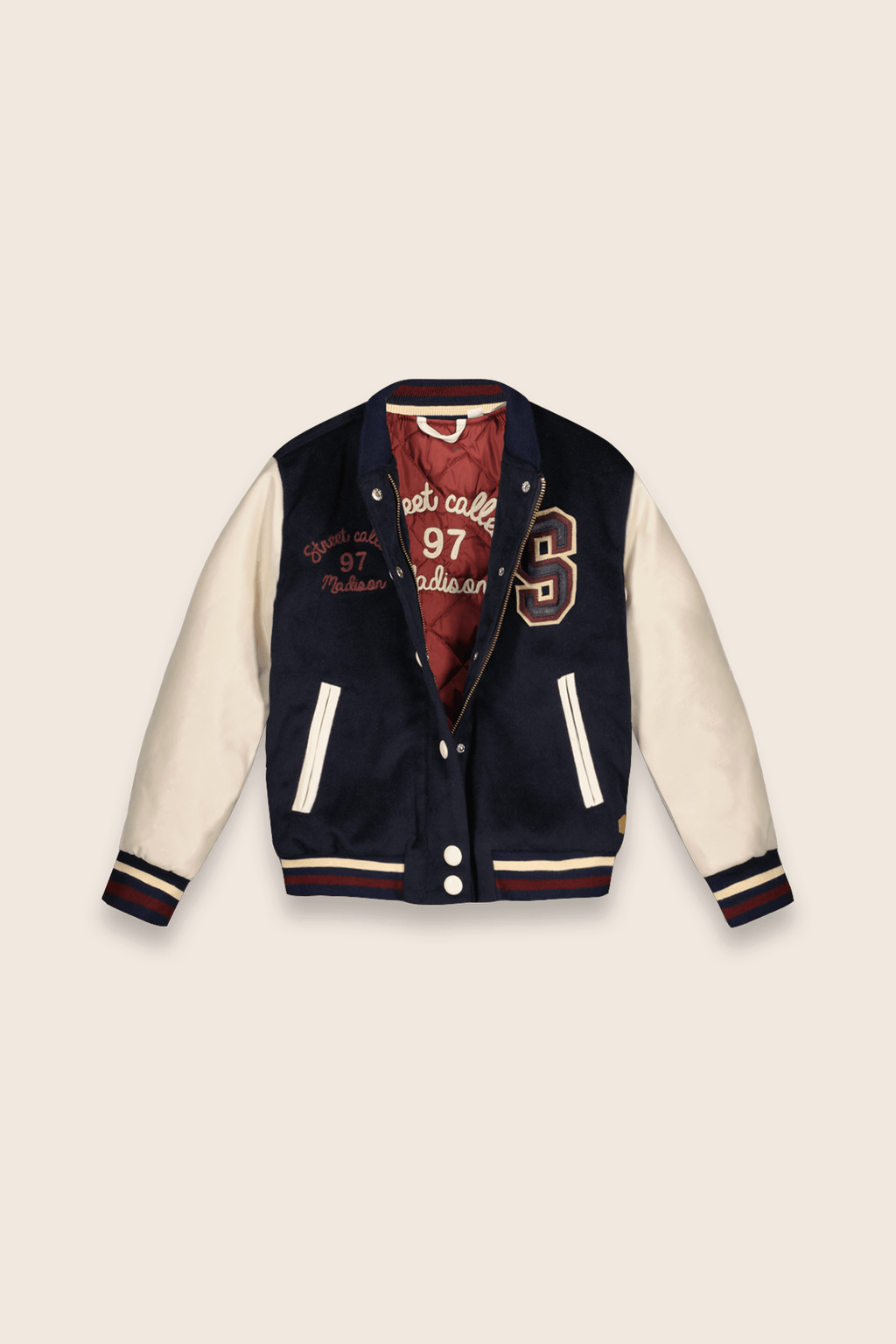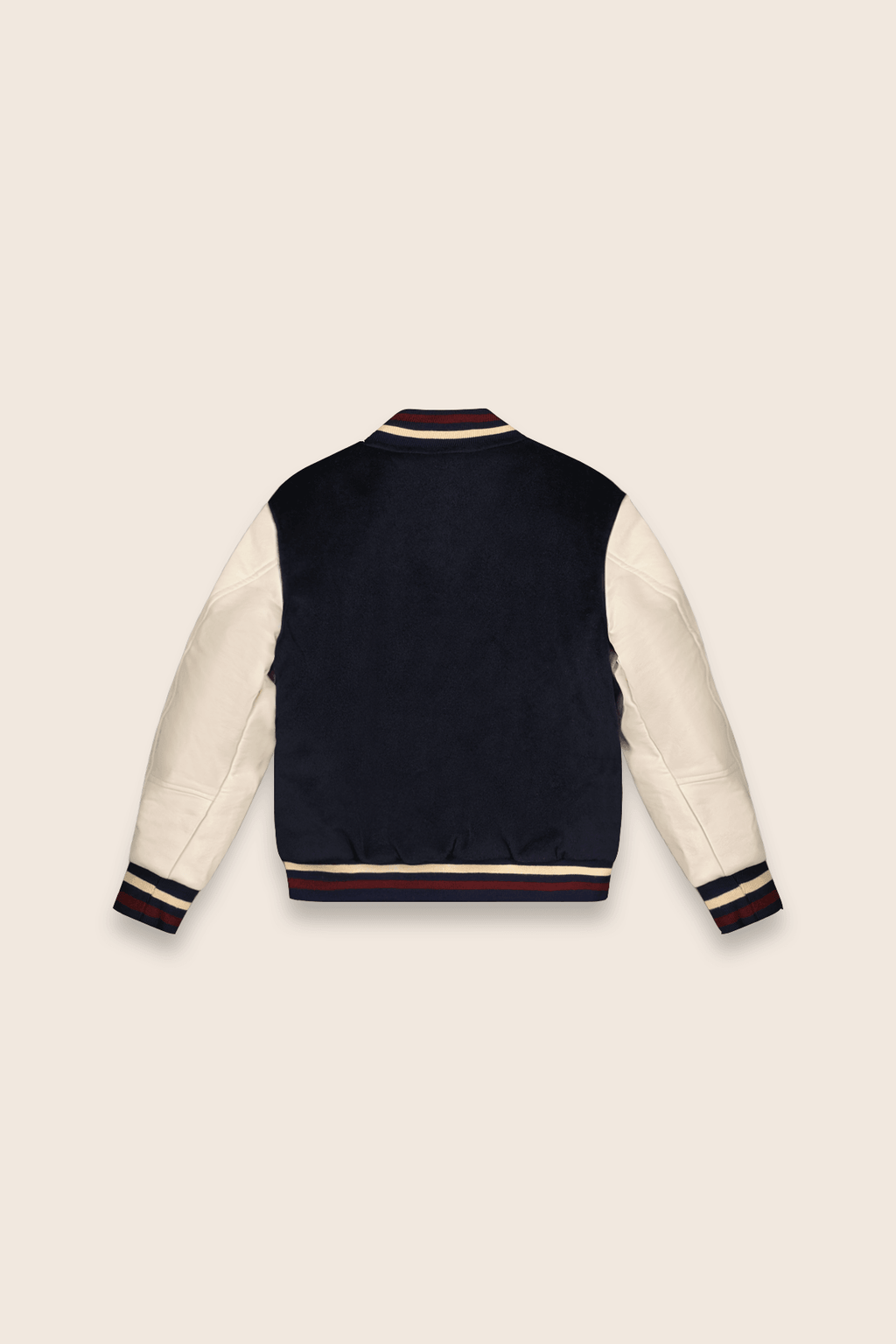 Charlie Ray varsity jacket. Deze toffe baseball jas heeft een navy wollen body en off white imi leren mouwen. Hij heeft een warme padding en een rits sluiting achter de drukkers. Hij is afgewerkt met stoere applicaties en gestreepte rib boorden.