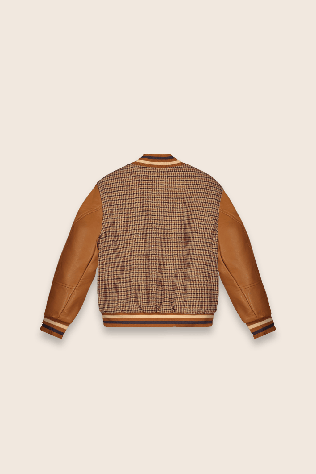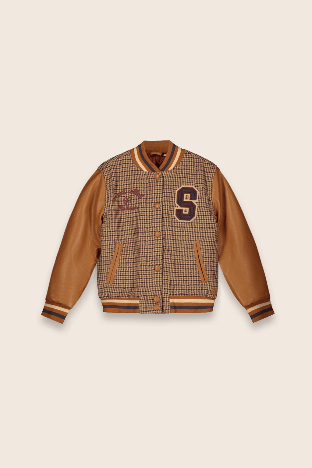 Charlie Ray varsity jacket. Deze toffe baseball jas heeft een geruite wollen body en camel imi leren mouwen. Hij heeft een warme padding en een rits sluiting achter de drukkers. Hij is afgewerkt met stoere applicaties en gestreepte rib boorden.