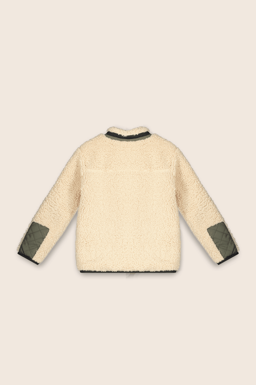 Charlie Ray teddy jacket BEAR in off white teddy. Heerlijk jasje kun je zowel binnen als, op de minder koude dagen, ook buiten kunt dragen. Hij is afgewerkt met sportieve nylon details in army en navy en heeft een handige rits sluiting.