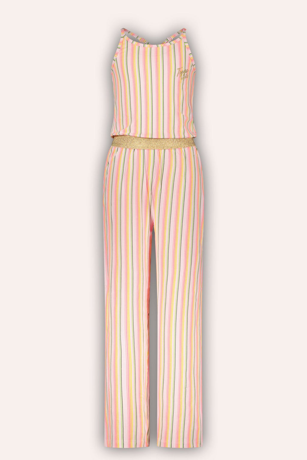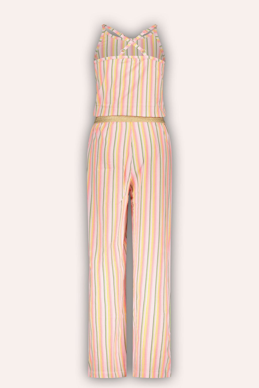 Laat je opvallen in de feestelijke jumpsuit 'Mara', gehuld in vrolijke kleuren met een gouden glitter tailleband, gemaakt van comfortabel biologisch katoen. Deze speelse outfit biedt niet alleen een modieuze uitstraling, maar vertegenwoordigt ook een bewuste stap richting duurzaamheid. FOR A BETTER NEXTERDAY. Wist je trouwens dat je door het scannen van de QR code de reis kunt zien die dit kledingstuk al heeft afgelegd? Verkrijgbaar in de maten 92-152.