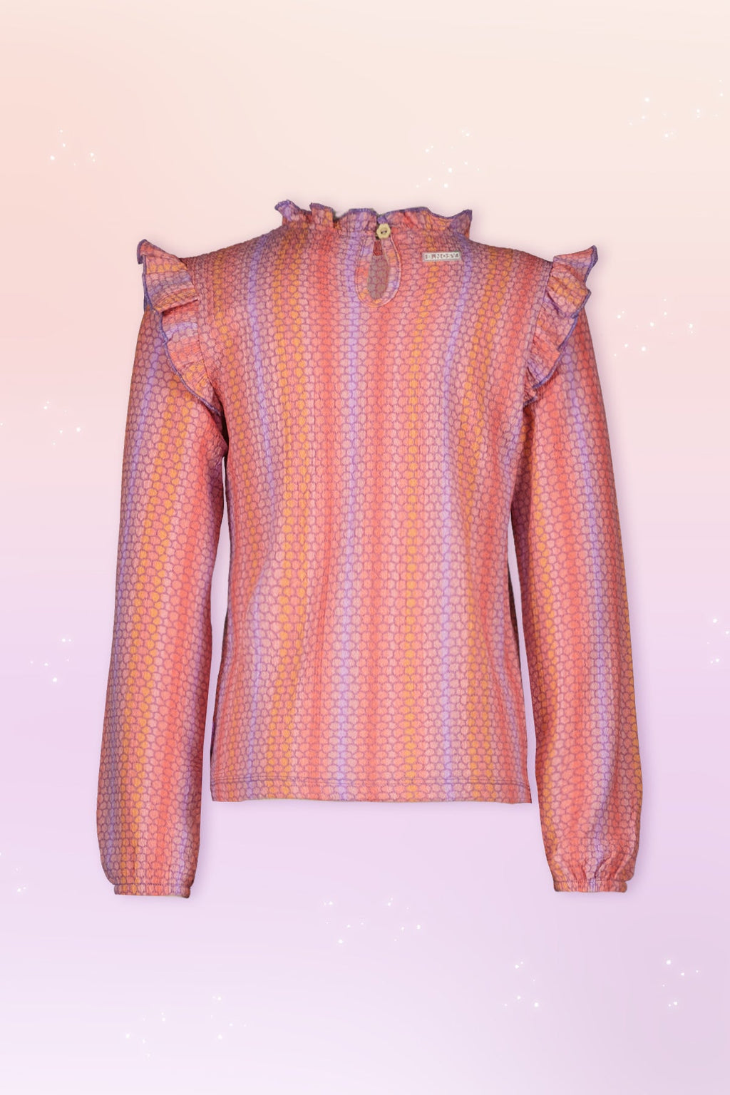 B.Nosy x K3 presenteert deze fantastische print in mooie warme kleuren met schubben details. Een fijne blouse die ook nog gemaakt is van gerecycled polyester. De ruffles bij de schouder en de lage turtle neck maken de blouse tot een top item. De blouse draagt zeer comfortabel door de stretch. Draag hem met een van de B.Nosy x K3 rokjes zoals Ruby of Resa.