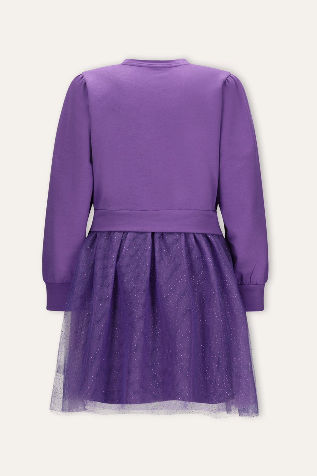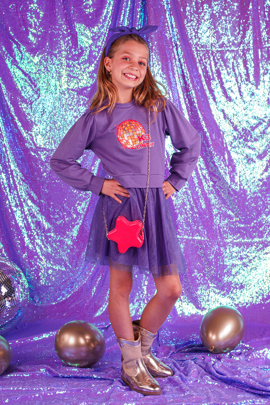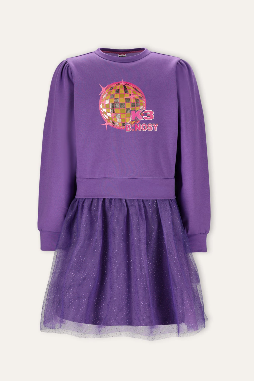 Steel de show met deze B.Nosy x K3 jurk Dasha. De jurk heeft een gave print van een discobal met het K3-logo en een tule rok met glitters. Dankzij de zachte sweatstof zit deze jurk ook nog eens heerlijk comfortabel.