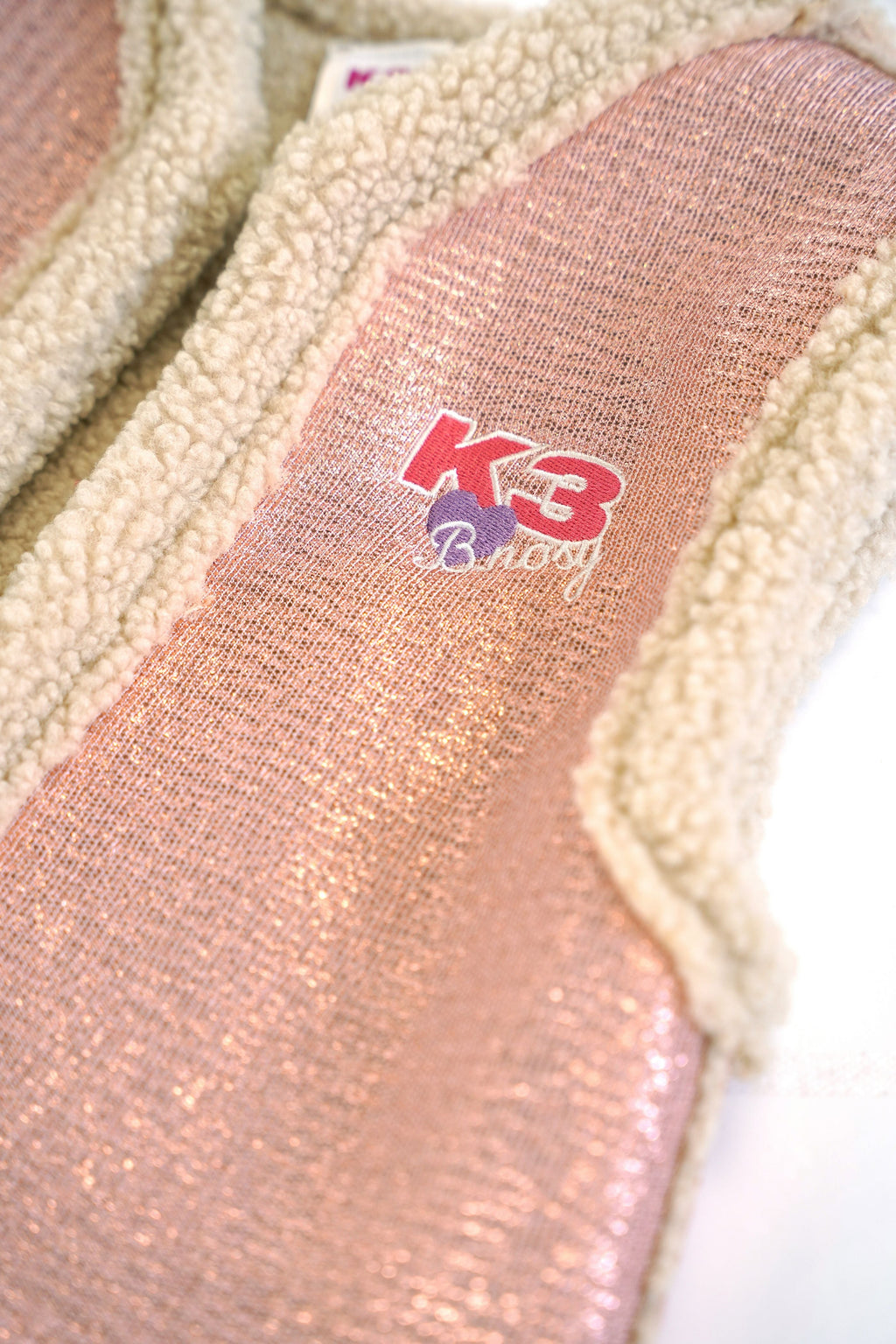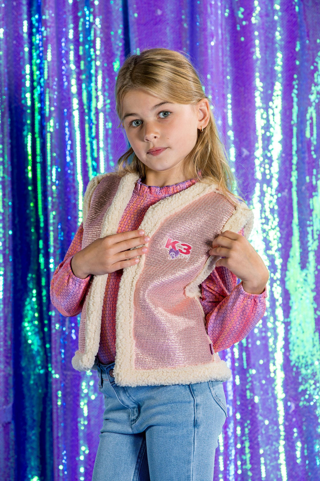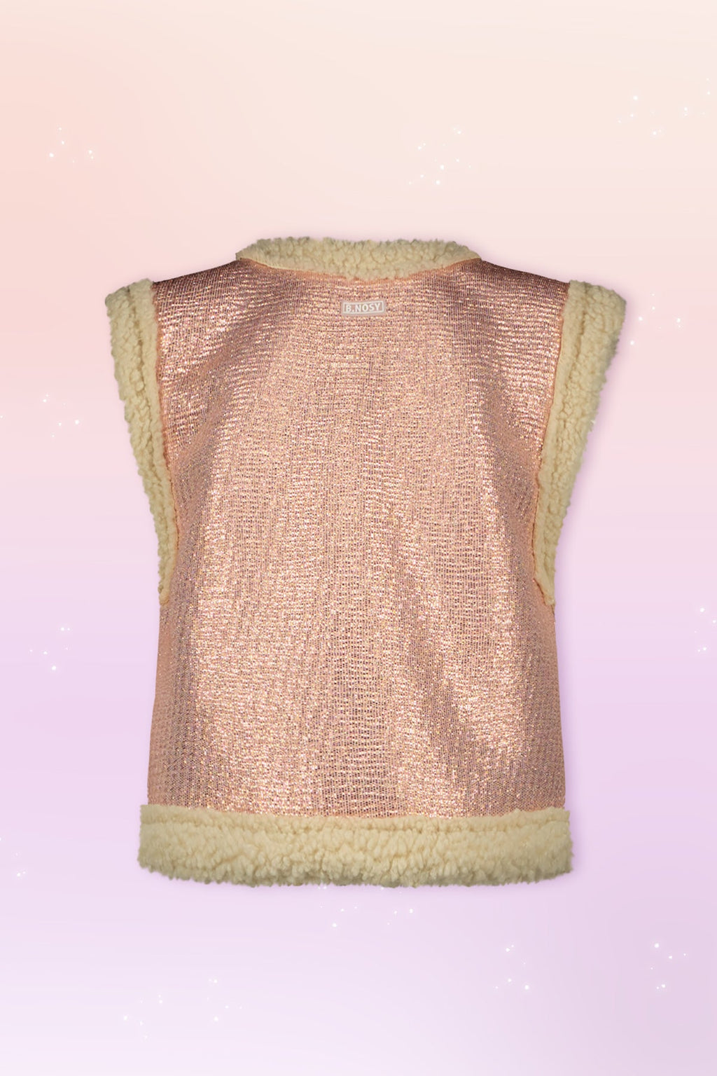 Schitter en schijn in dit mooie roze glitter gilet genaamd Gwen, afgewerkt met een teddy bontje, perfect op alle jurkjes en tops uit de B.Nosy x K3 lijn