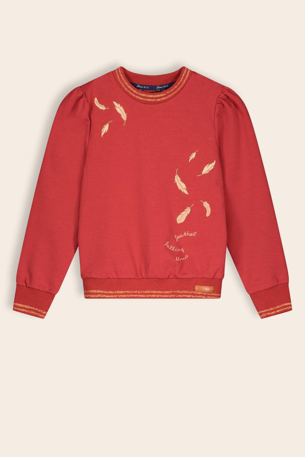 Geklede sweater ronde hals met lurex streepdetails bij de zoom, hals en manchetten. Dwarrelende veertjes geborduurd op het voorpand en pofmouwtjes voor de feminin touch. Draag je sweater op 1 van onze allovergeprinte rokjes met stoer sneakers.