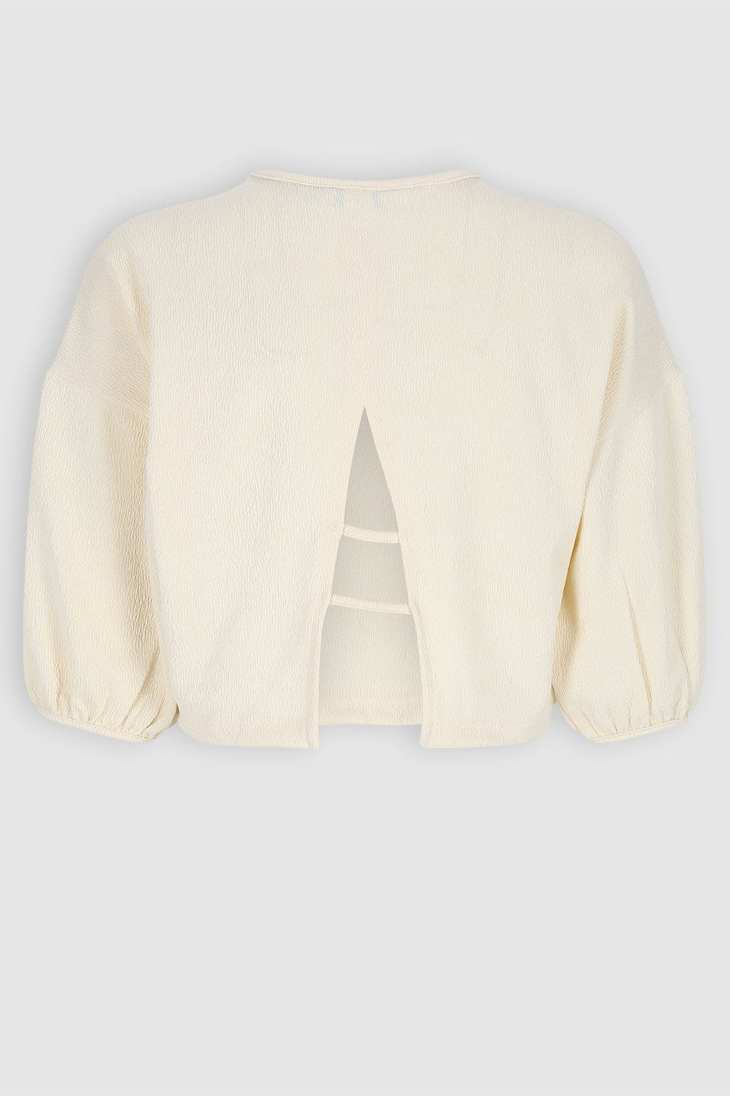 Cropped top met leuke open rug split detail. Lekkere wijde fit, leuk met het kanten topje Kaya eronder