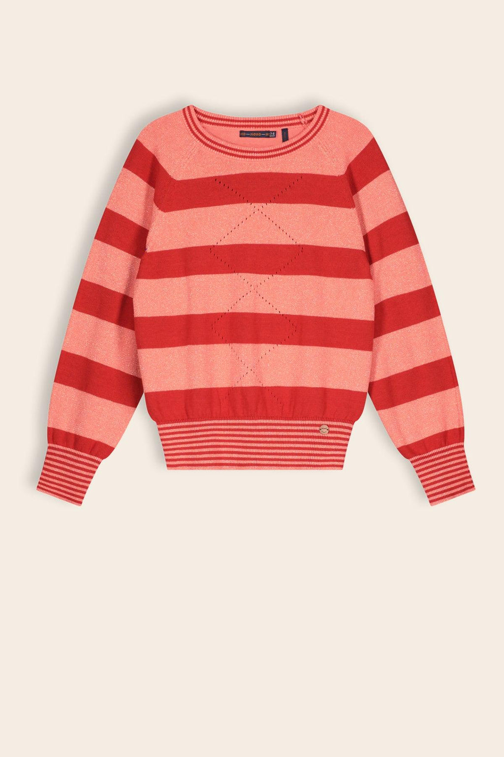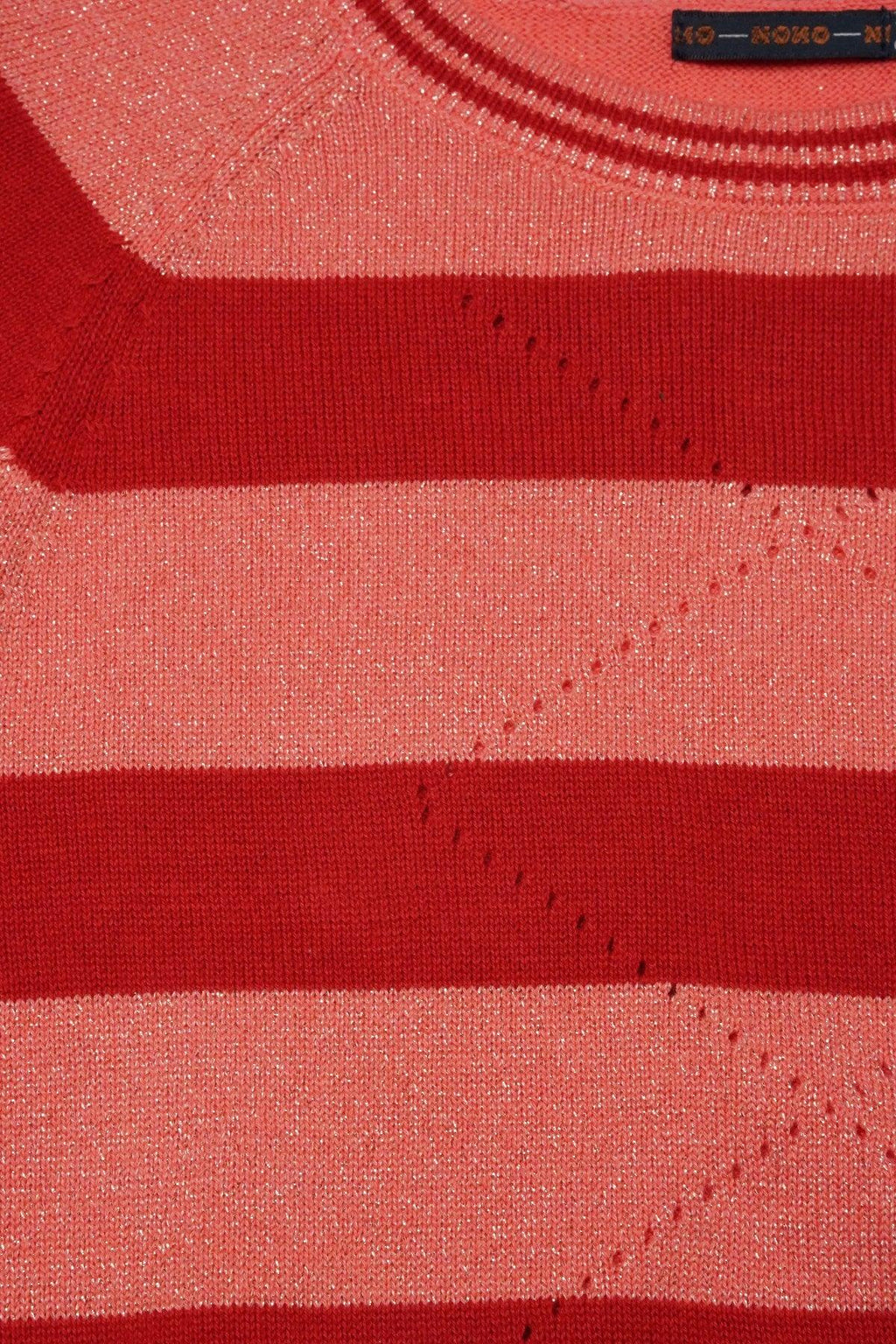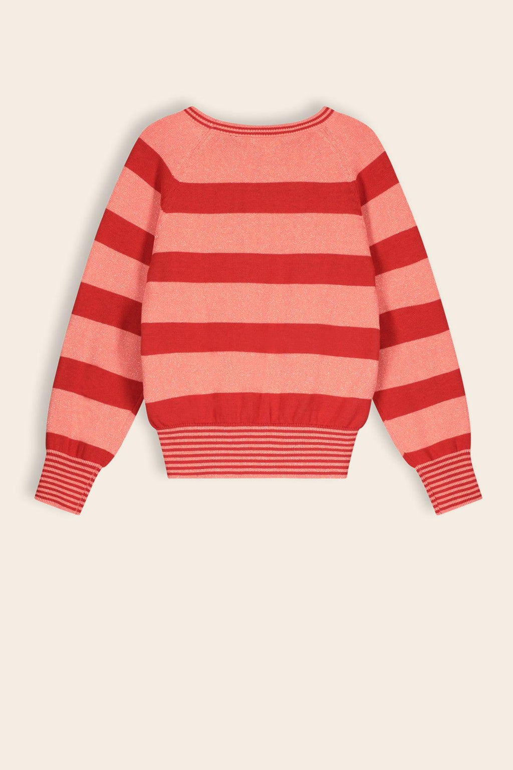 Verfijnde gestreepte gebreide trui met een mooi glansdraadje in de roze strepen. Combineer hem stoer op onze sweat broeken Secla of sporty chique op rokje Nadia.