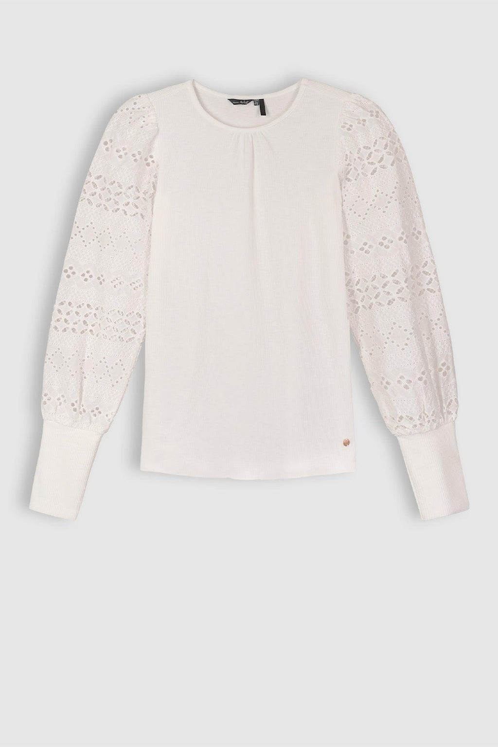 Met deze top steel je zeker de show. Embroidery anglaise geweven mouwen met hoge rib jersey manchetten en pofmouwen geven deze top het wauw effect. Het fijne is dat de body van ribjersey is, dus comfort en style in 1!