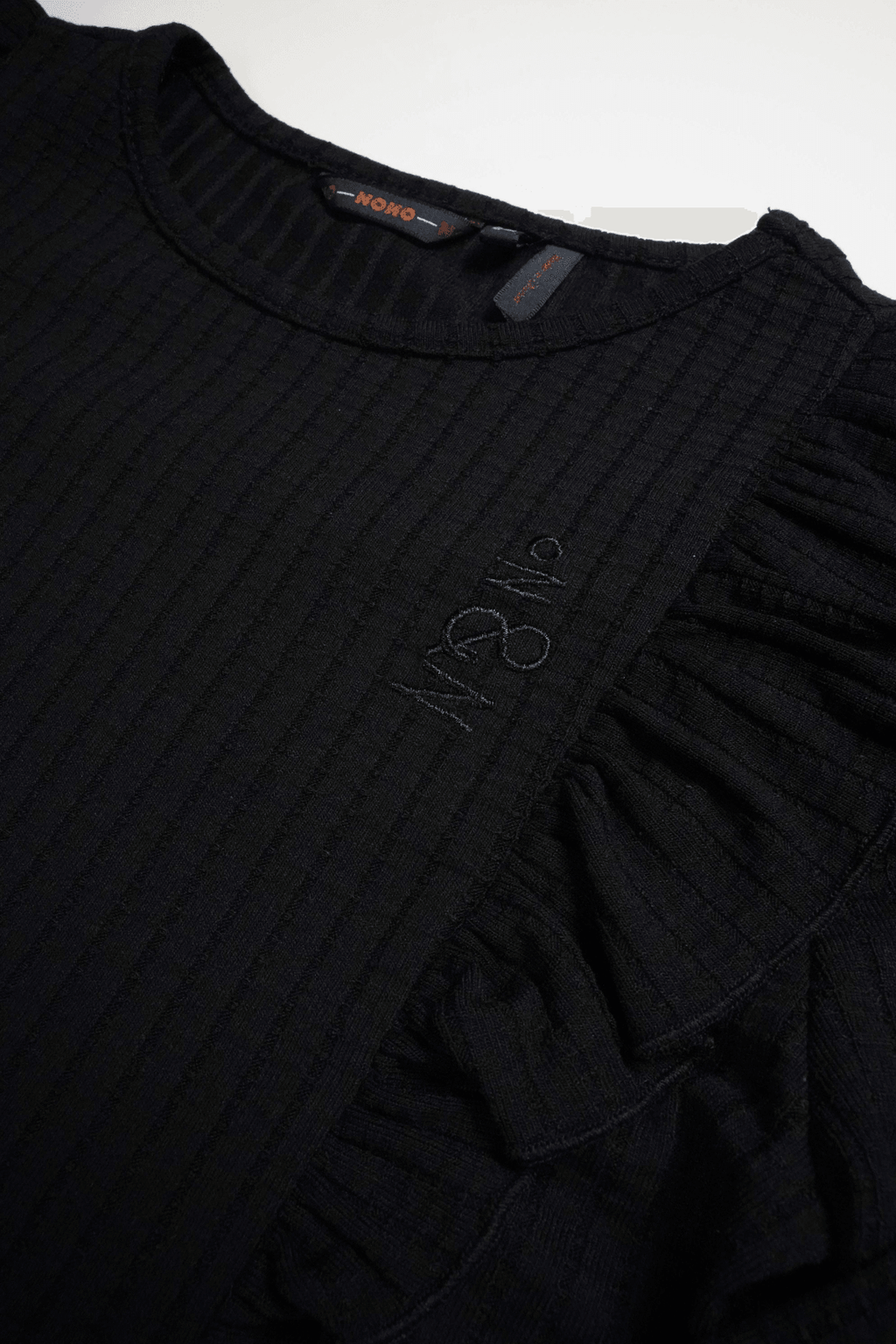 Uni saai? Het tegendeel bewijst deze top. Verfijnde rib jersey top met een leuke structuur. De pofmouwen en ruches maken deze top speciaal. Ideaal te combineren met alle geprinte rokken en broeken uit deze levering. |