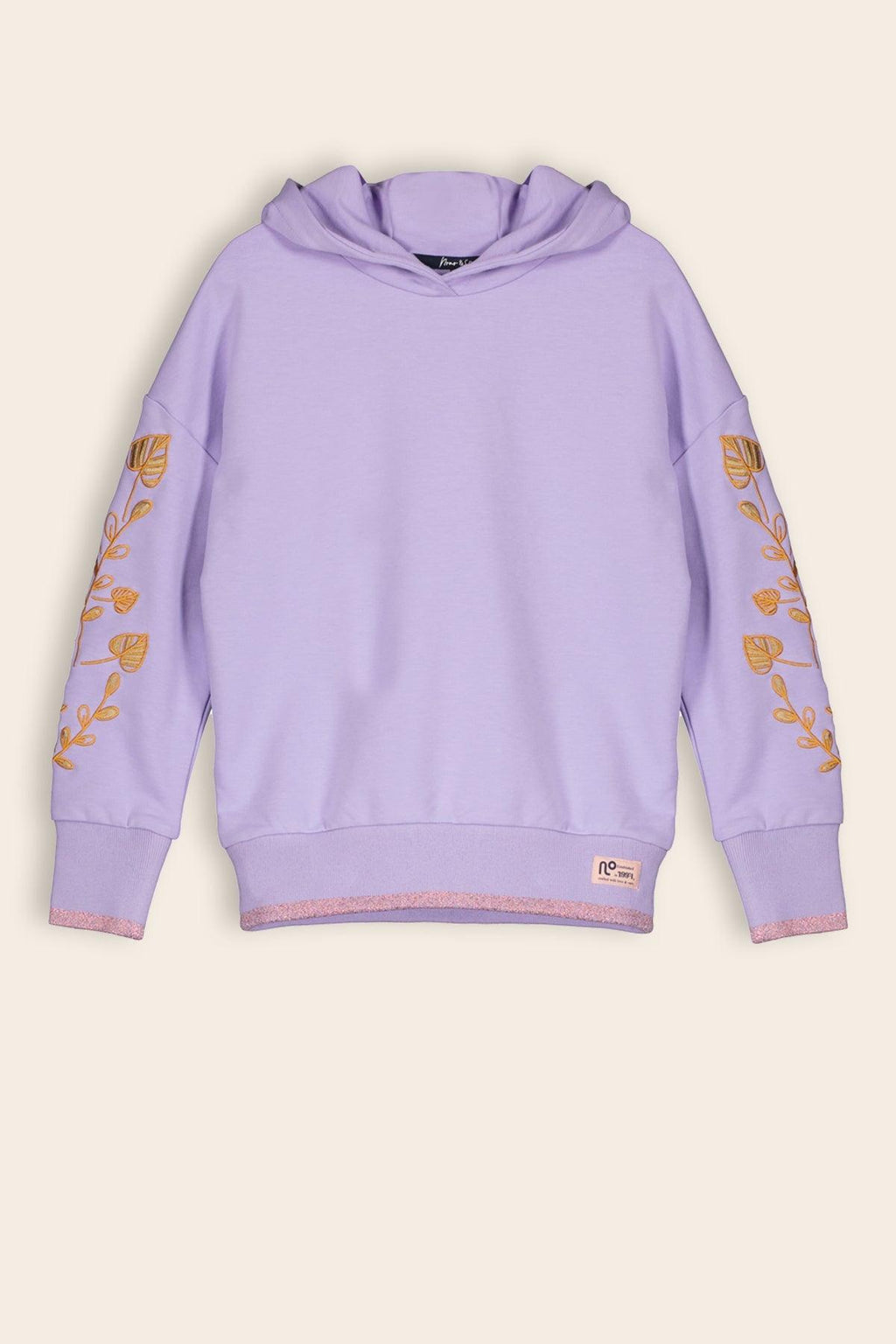 | Sweater met capuchon en borduursels. Begin je dag goed met deze hoody. De manchetten en rib bij de zoom hebben een lurex glans streepje wat je sweater net dat extra's geeft. |