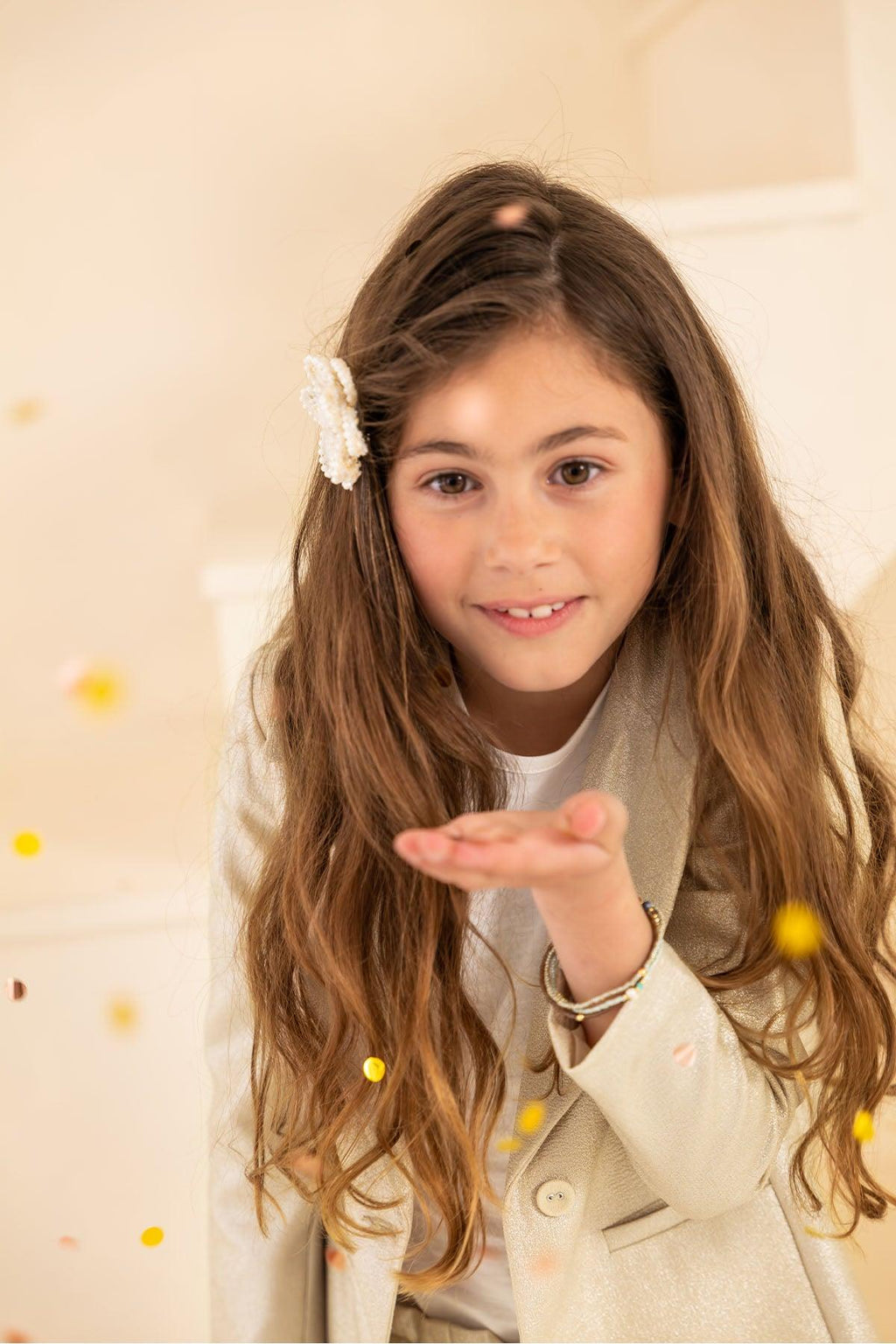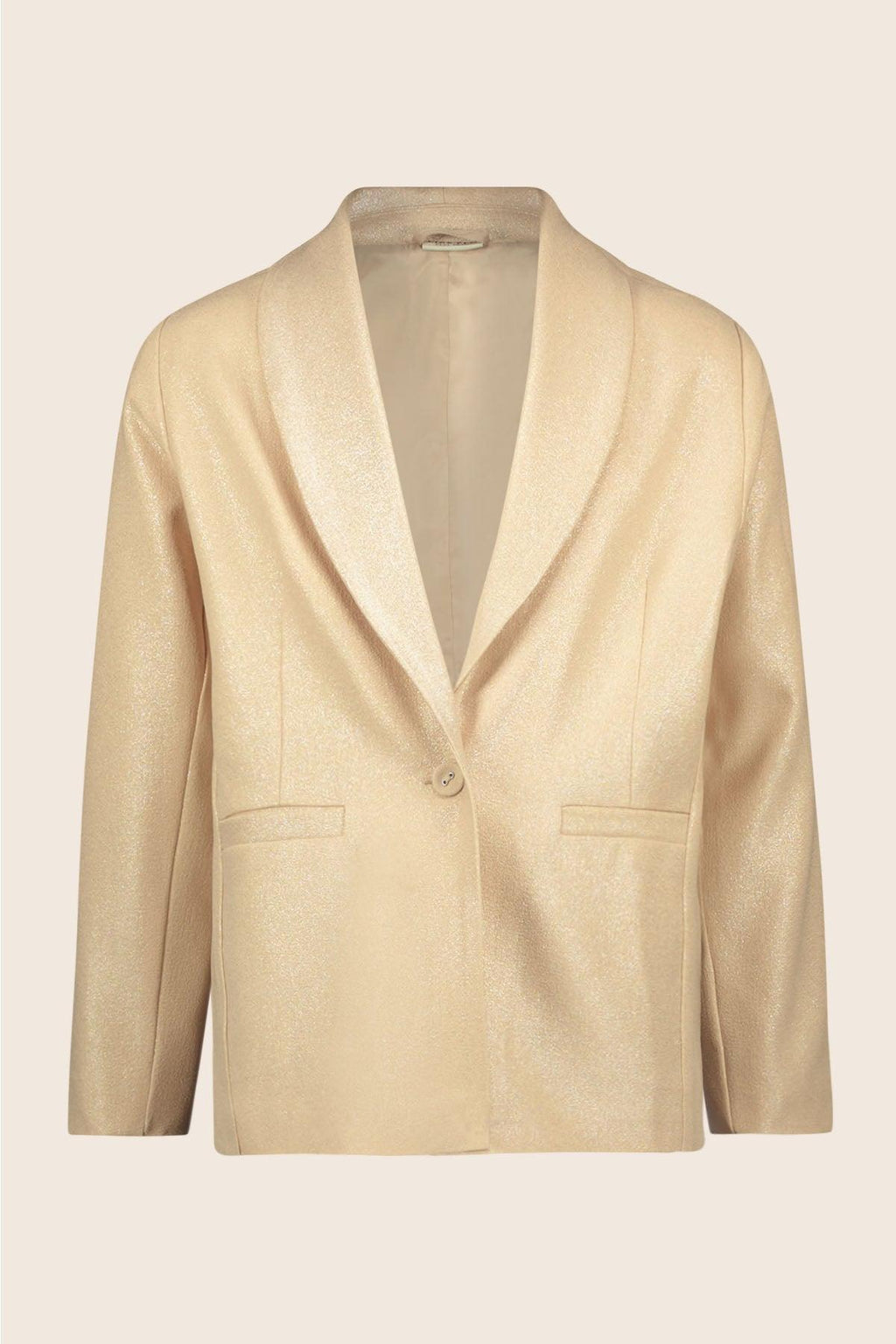 Glitter en Blazers zijn mega hip en nu samen gecombineerd in onze blazer ALICE. Deze prachtige metallic Champagne kleur past overal bij. Combineer hem als pak met onze broek FREDERIC. Of met een van onze tops ELISA en een rokje SAIGON