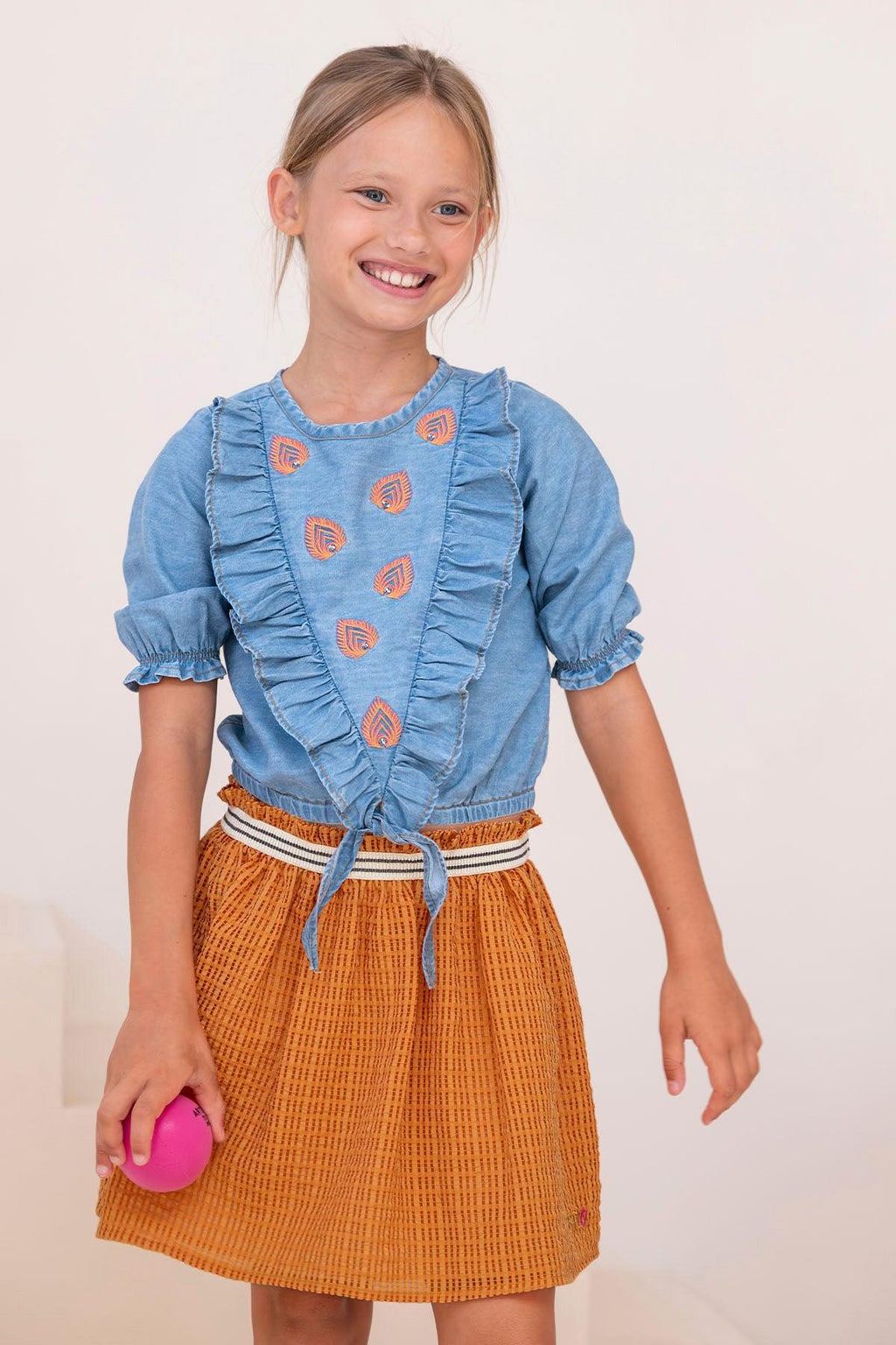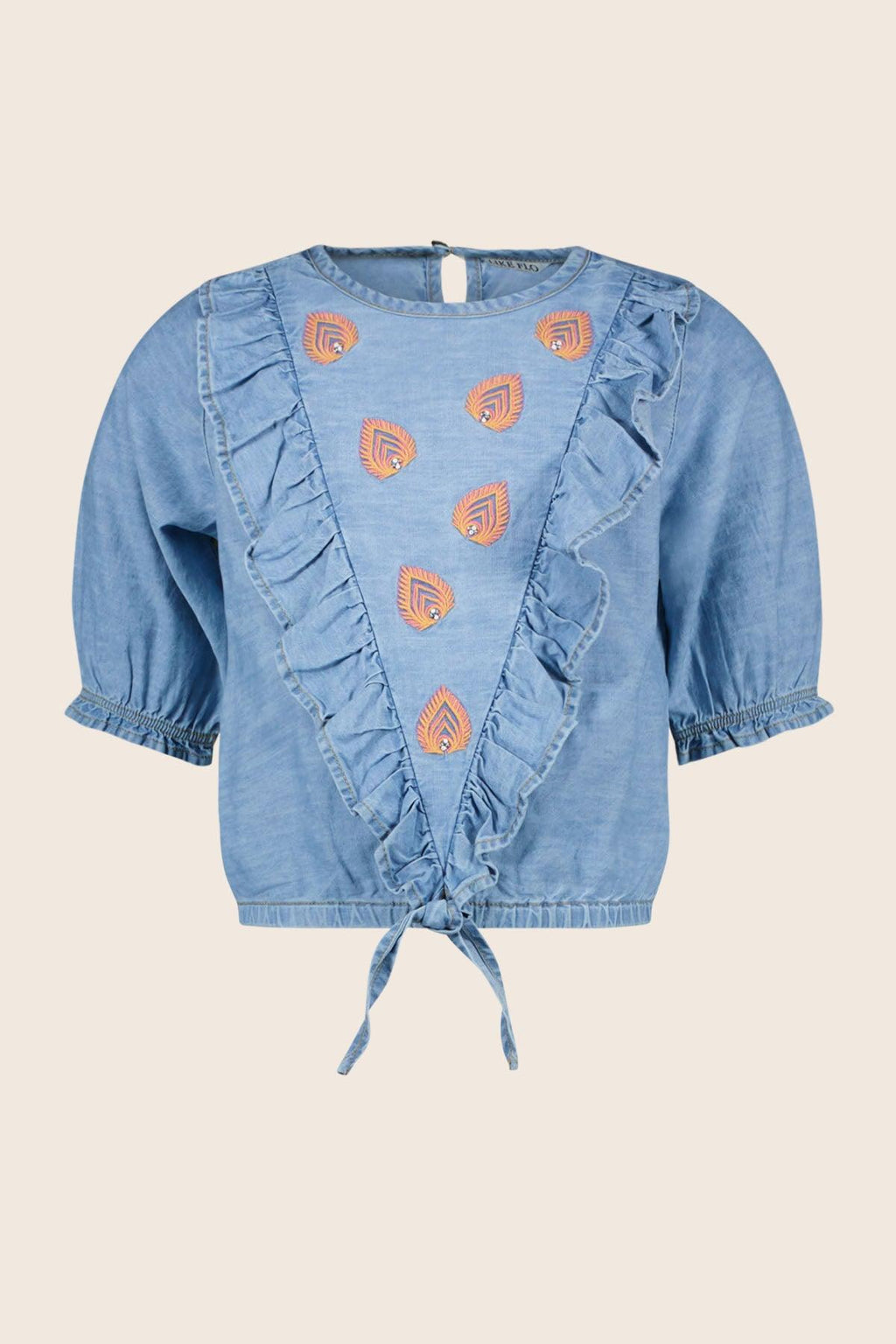 Deze fantastische denim knoopblouse WENDY wil je gewoon hebben. De blouse is voorzien van ruffles en prachtig borduurwerk om het helemaal af te maken. Bovendien komt de kleur van het borduurwerk overeen met het rokje VALLON, waardoor het een geweldige set vormt. Natuurlijk is de blouse ook met andere items te combineren.
