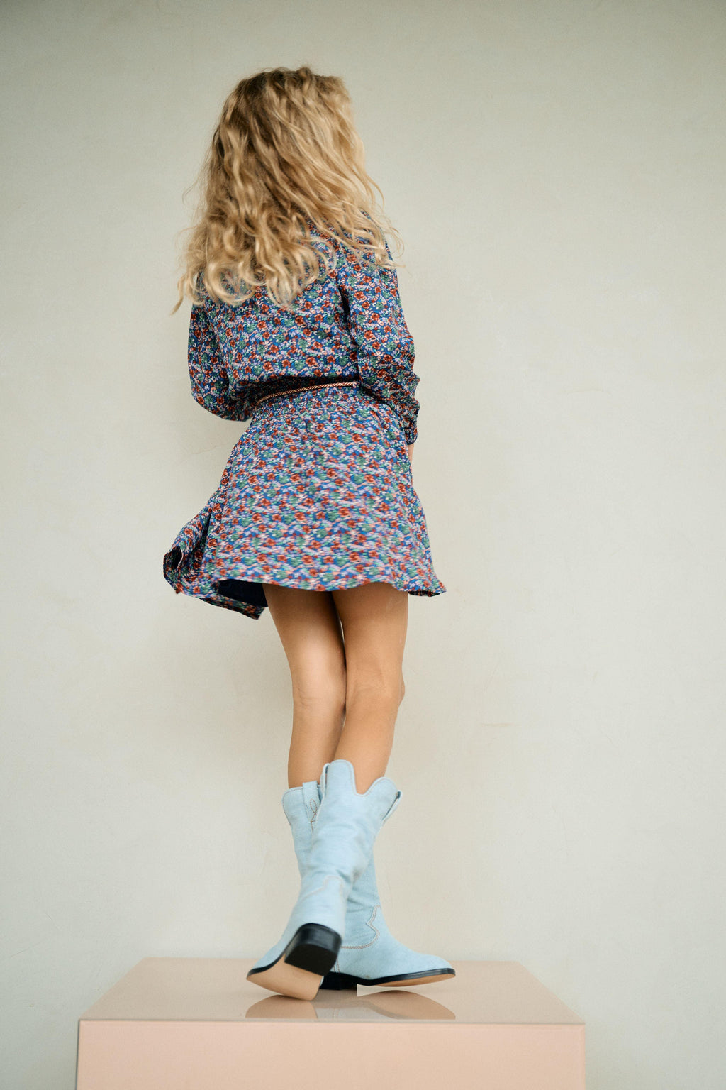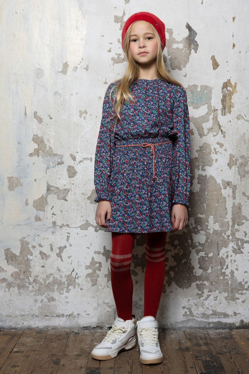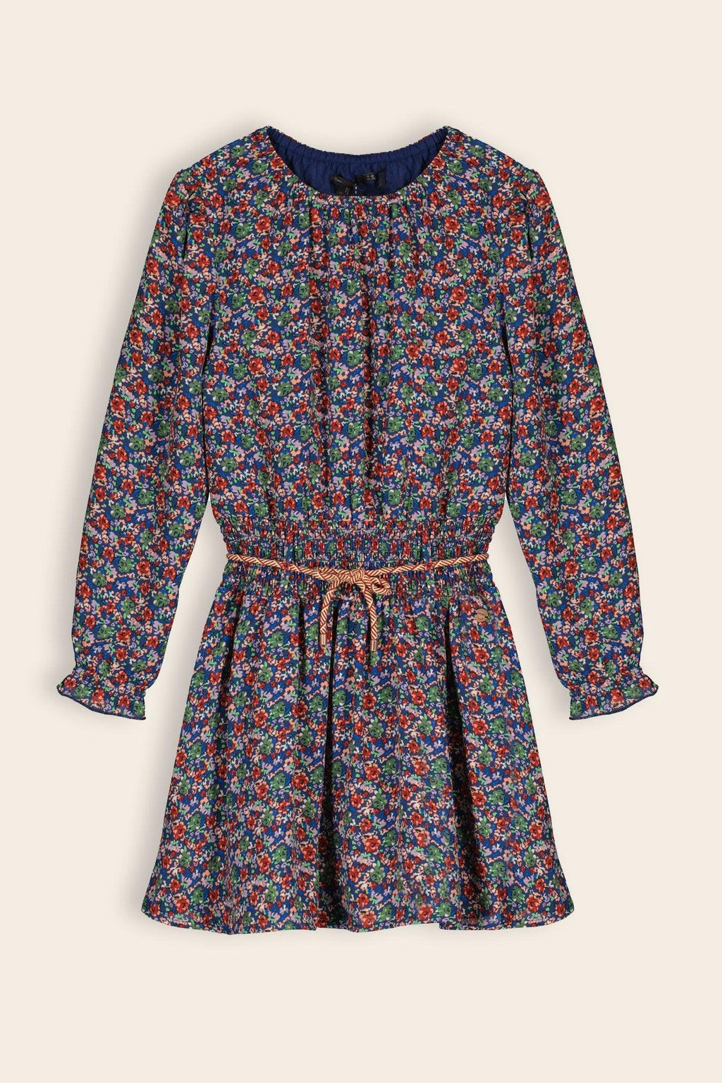 Gebloemde jurk gemaakt van gerecycled polyester en gevoerd met een dunne katoenen voering. Leuk contrast rood/witte koordje in de taille maakt de jurk af!