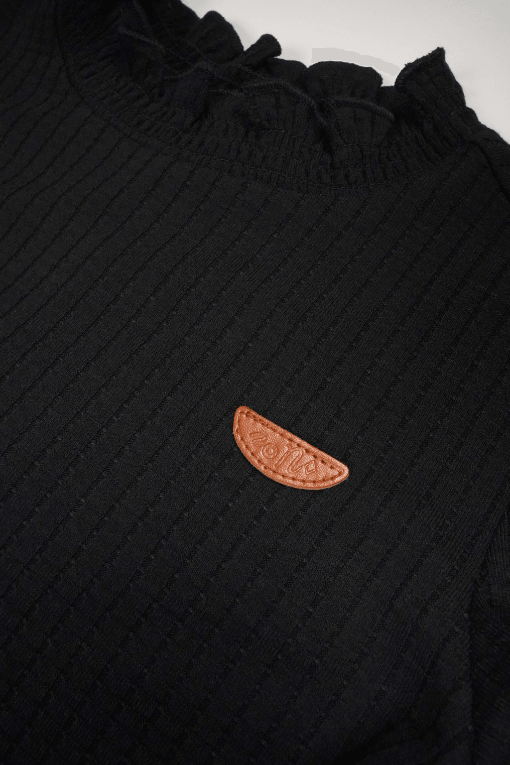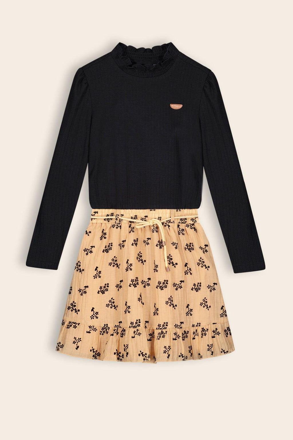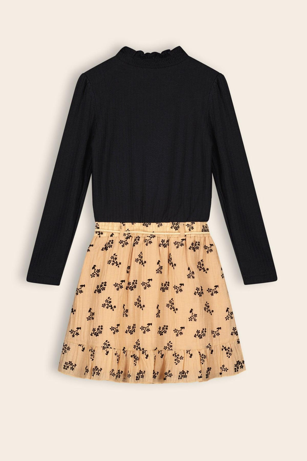Combi jurk met een fancy rib jersey bovenkant en chique licht doorschijnende voile rok met zwarte flock print. Steel de show deze winter! Het rokdeel is gevoerd met een dunne katoenen voering.