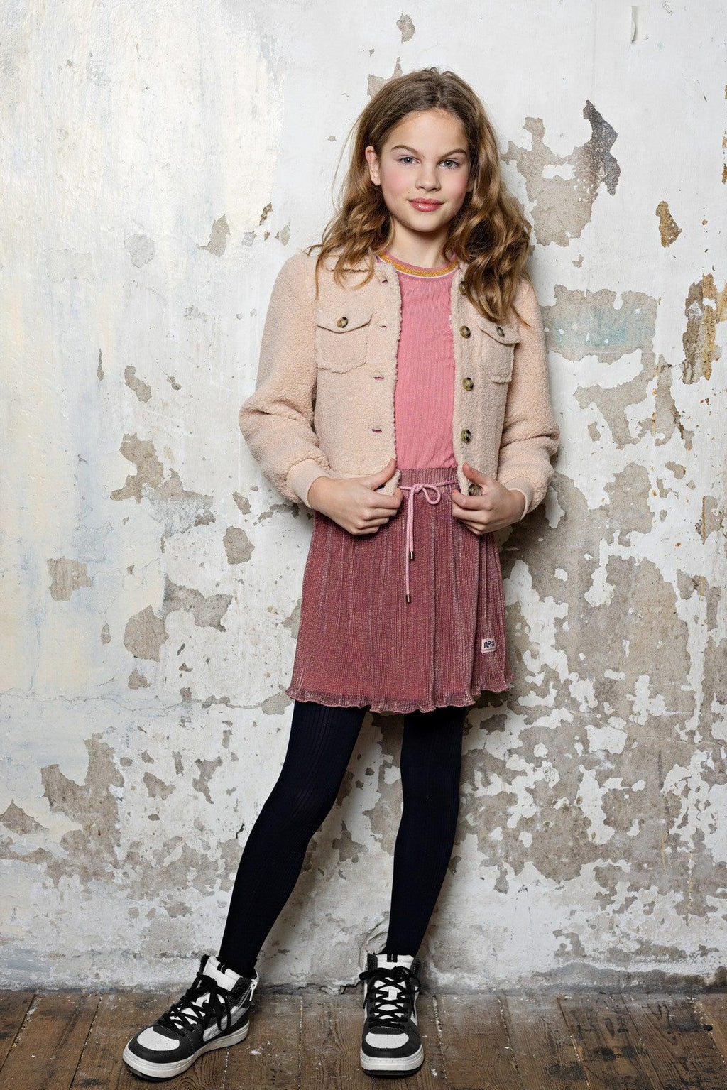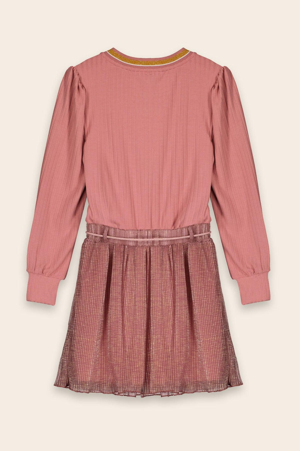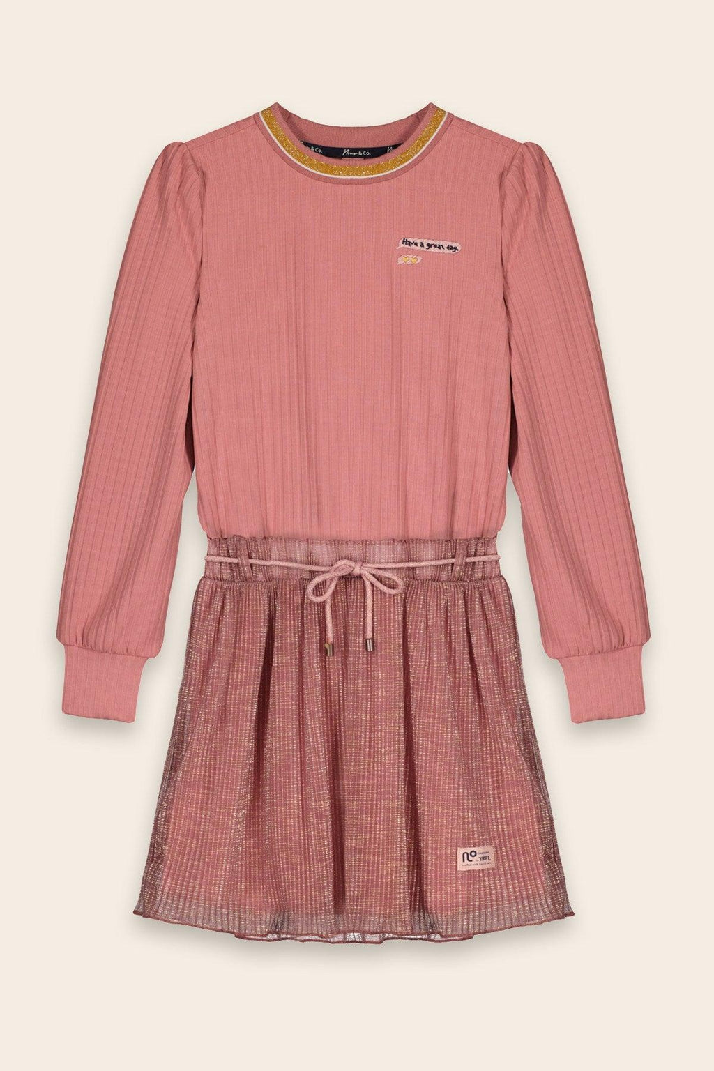 Pink it is! Roze zachte rib jersey top met een contract ribje bij de nek en een zwierig licht doorschijnende rok gevoerd met jersey. Gegarandeerd de nieuwe lievelings jurk van je dochter!