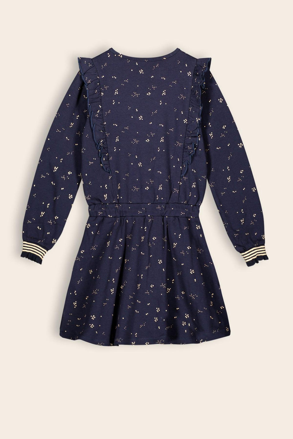 Little Navy jurk, onmisbare basis jurk in ieder meisje haar kast. Leuk detail, de mouwen hebben een ribmanchet met een ruffle randje en gouden streep. Gemaakt van een zwaarder jersey interlock voor de koude winterdagen.