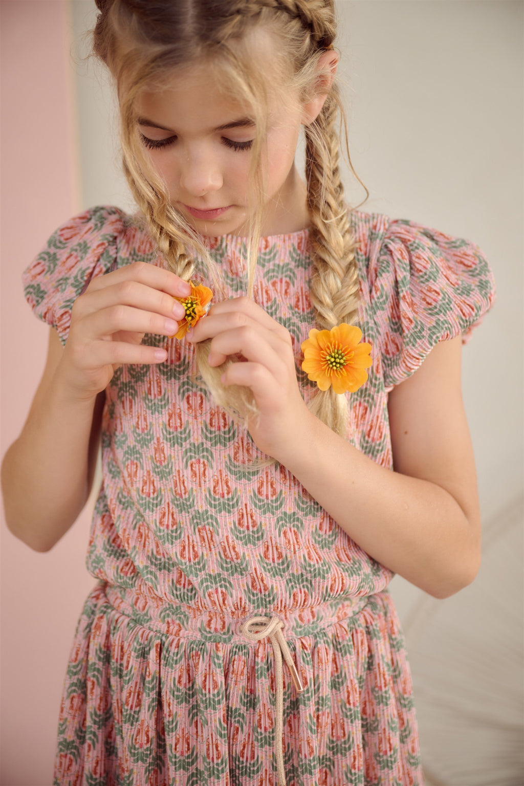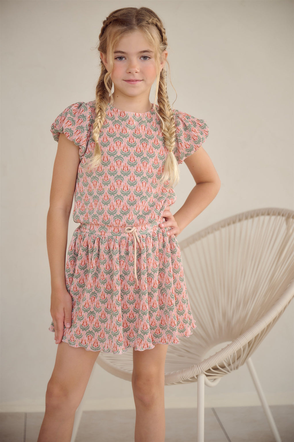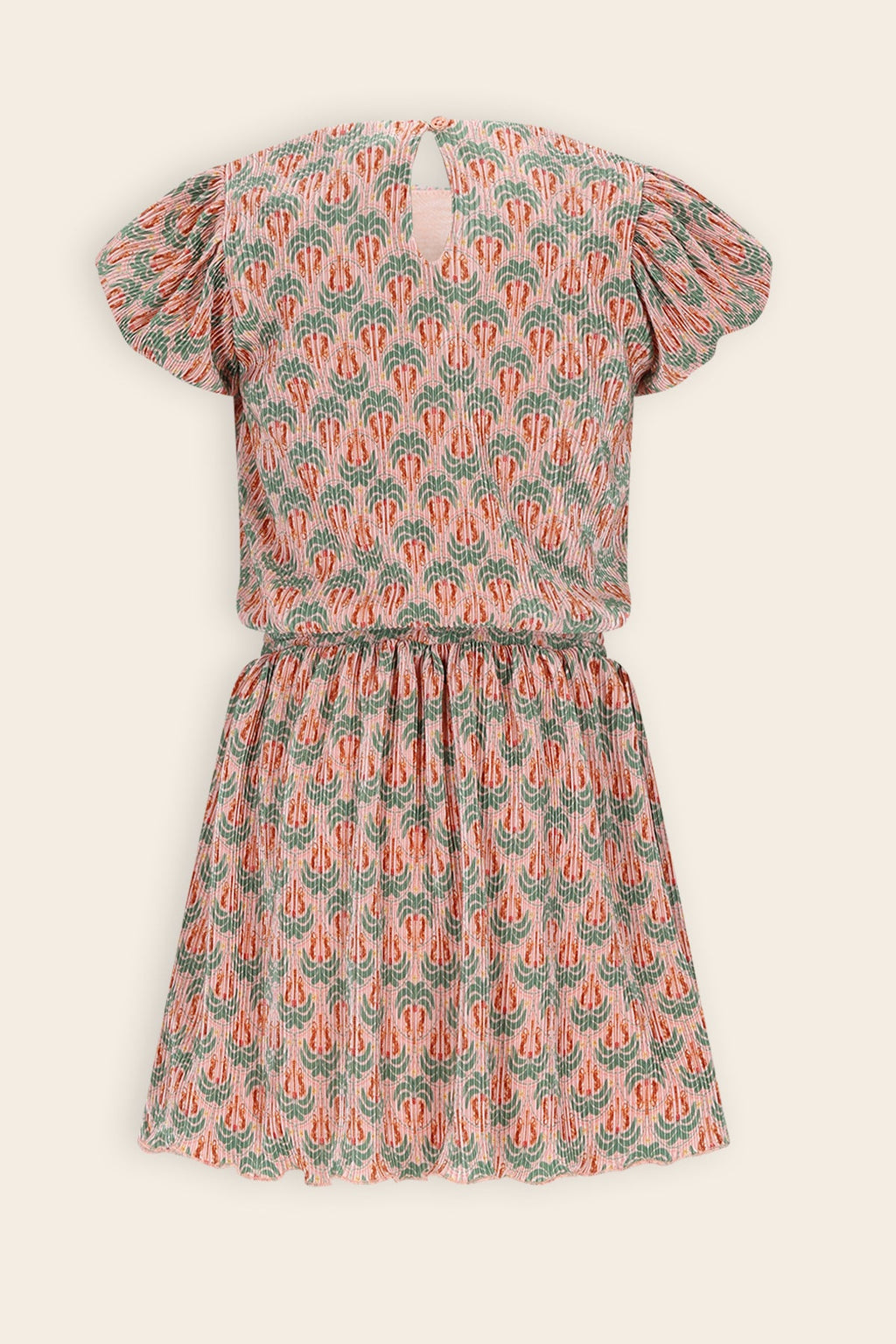 plissee jurk met palmbomen print. Gevoerd met een zachte jersey. Handige zomerjurkje voor school of het strand. In de taille zit een lurex koordje om de taille aan te snoeren. Met ballon mouwtjes. Gemaakt van 95% gerecycled polyester