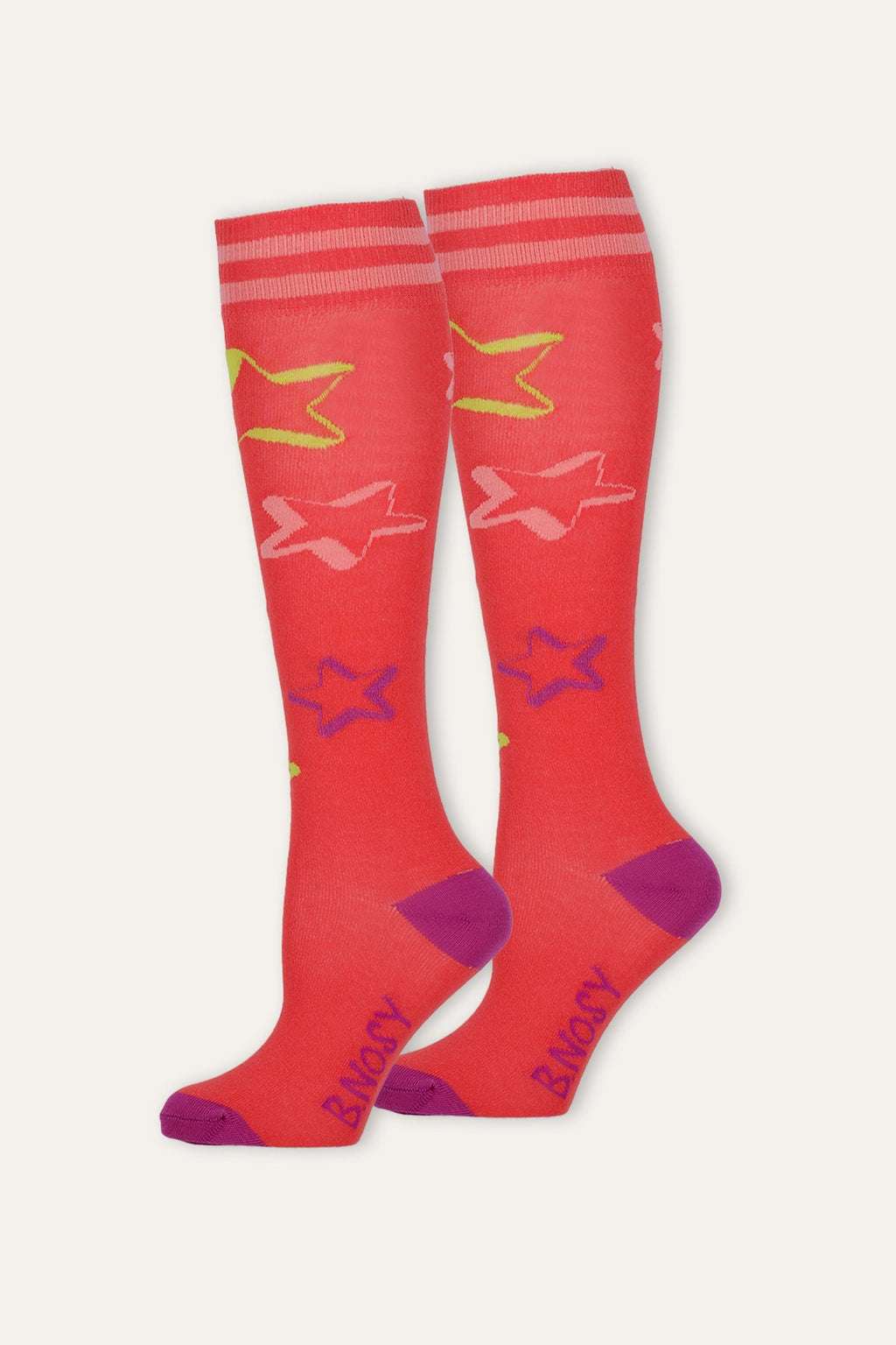 Pop of color tot aan je knieën! De Missy kniekousen van B.Nosy maken elke outfit nét wat leuker. Met de vrolijke sterrenprint, speelse strepen en contrasterende teen/hak zijn dit echte statement socks. Perfect om te combineren met je favoriete B.Nosy jurk of rokje, en natuurlijk om lekker in te bewegen, spelen en shinen!