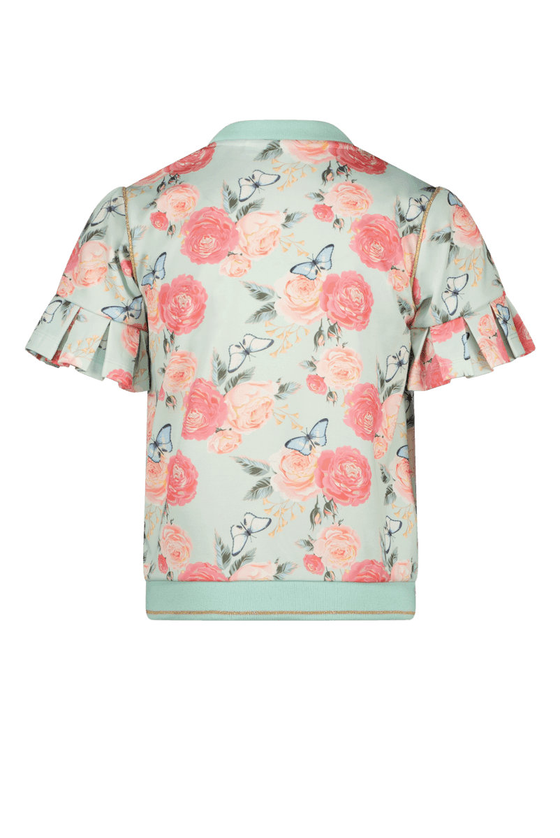 Vrolijke top in bloemen- en vlinderprint. Het geplooide gedeelte onderaan de mouw maakt dit model extra bijzonder.