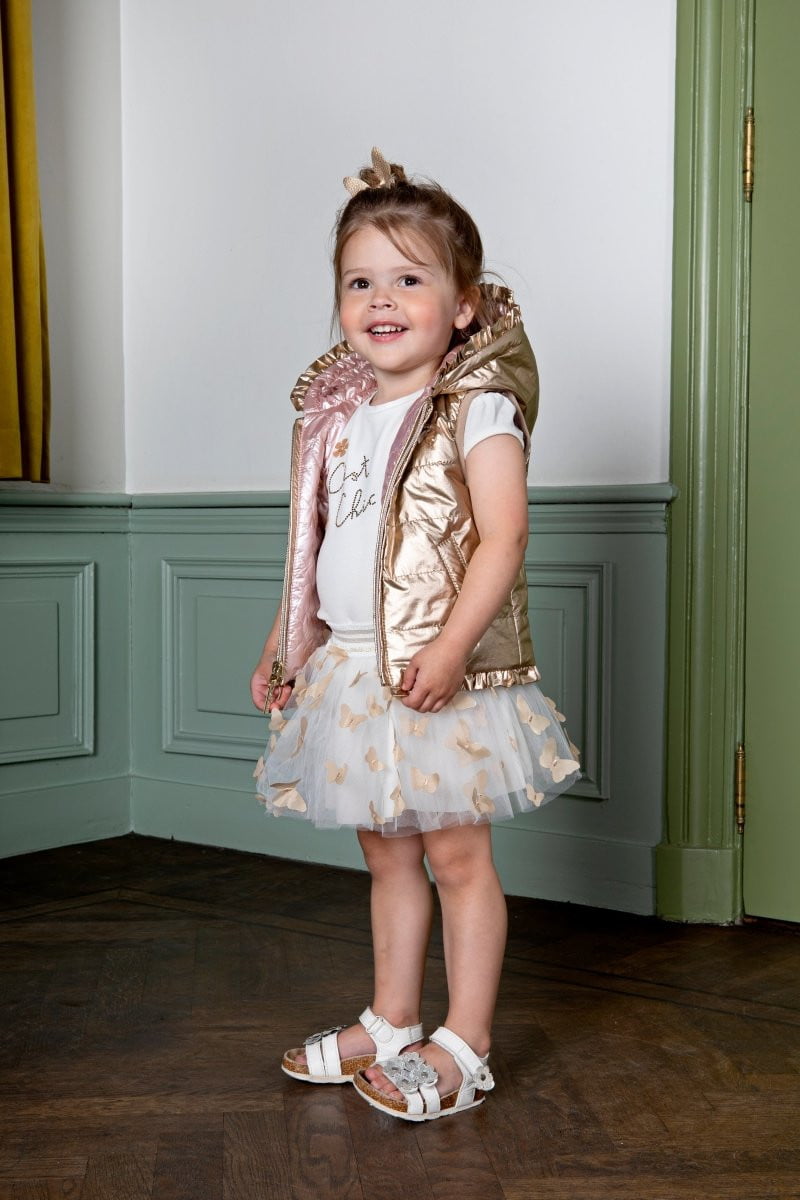 T-shirt met op de borst een mooi glimmend artwork. De voile bloemetjes maken dit artikel super lief.