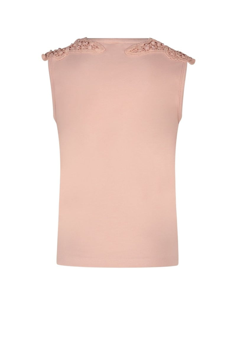 Mouwloos T-shirt met op de schouders een prachtige opengewerkte vlinder applicatie.
