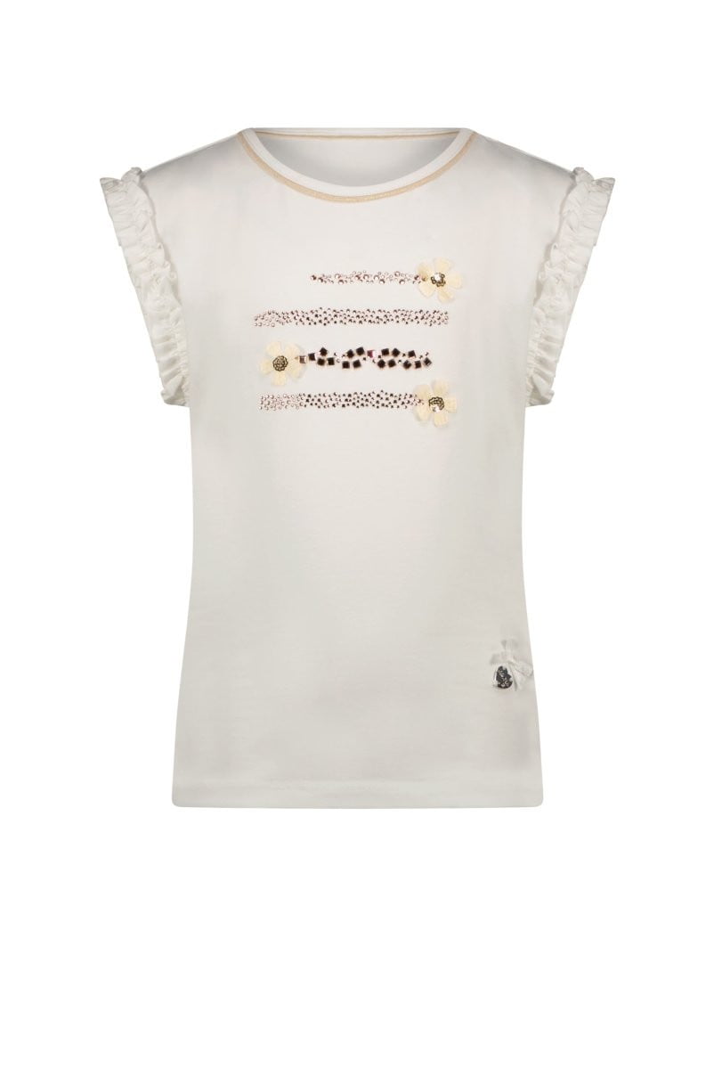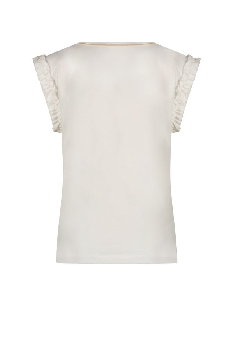 T-shirt met op de borst een mooi glimmend artwork. De mouwopeningen zijn afgewerkt met mooie smalle ruffles.