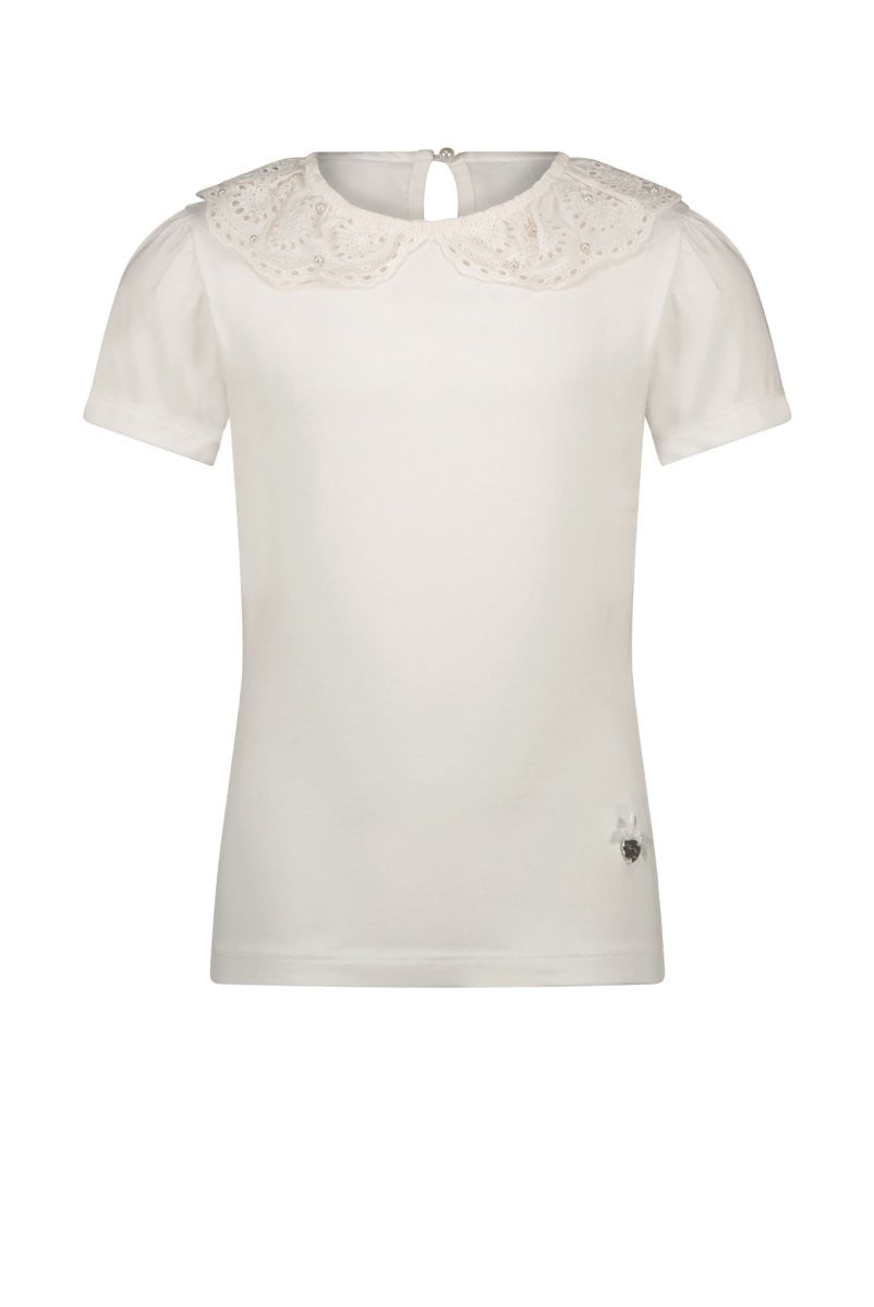 T-shirt met een prachtige kanten kraag. De opening achter in de nek sluit met een fraaie parel-knoop.