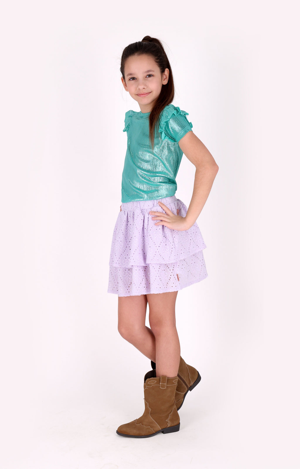 Laat je meiden stralen in deze vrolijke lavendel rok van B.Nosy! Gemaakt van een comfortabele broderie stof met rek, is deze rok met twee lagen een trendy en speels item. De soepelvallende stof zorgt ervoor dat ze er makkelijk in kunnen bewegen. Een echte all-time favorite die je makkelijk mixt en matcht!