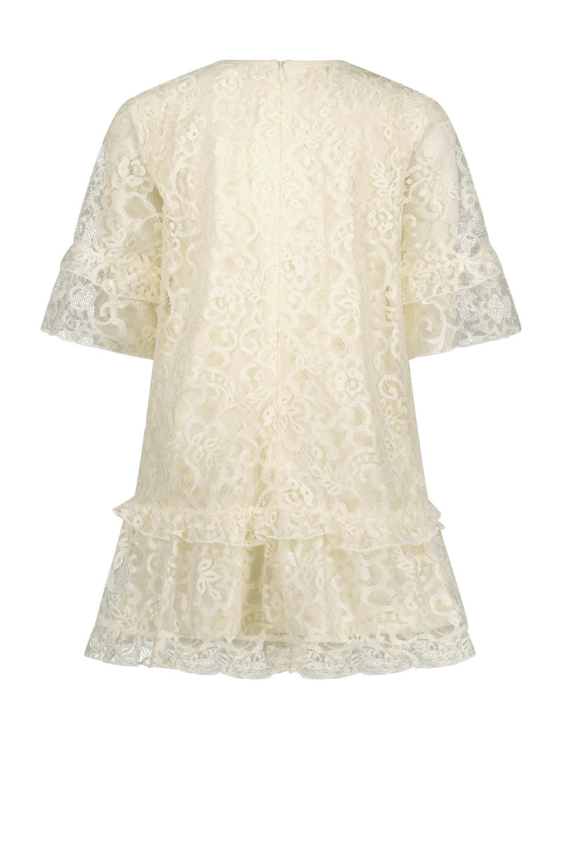 Luxe kanten jurk met met ruches en driekwart mouwen. Deze jurk is gevoerd met een single jersey, dus het draagcomfort is ook gegarandeerd.