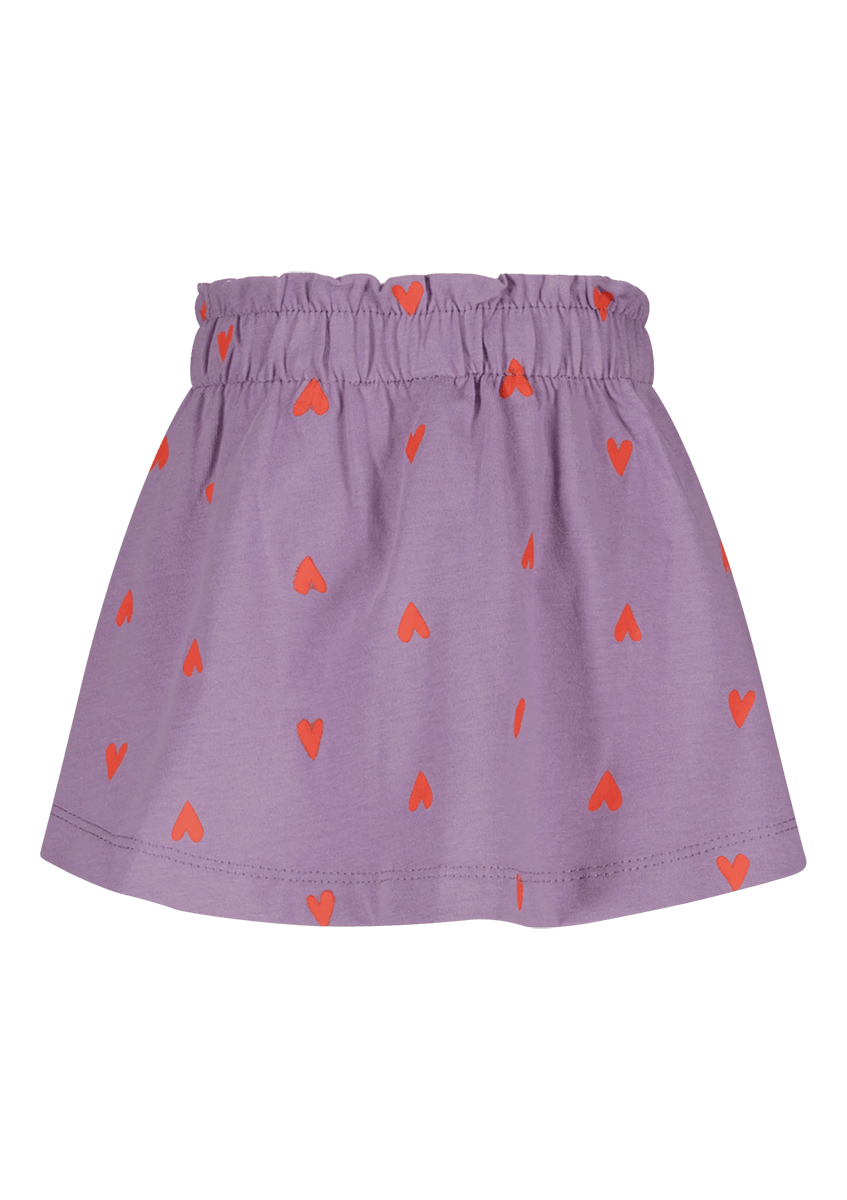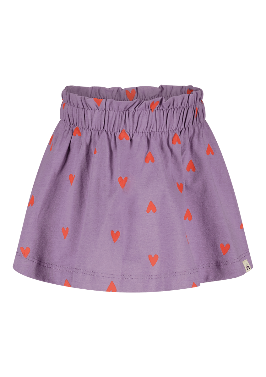 Zoet, zoeter, zoetst! Deze Sara rok is een echte parel! De paarse kleur met roze hartjes maakt 'm lekker girly. De elastische tailleband maakt deze rok super comfortabel. Met dit item kun je dus alle kanten op. Combineer het met de stoere Fos trui of met de geruite Philou blouse. Gemaakt van duurzamer katoen!