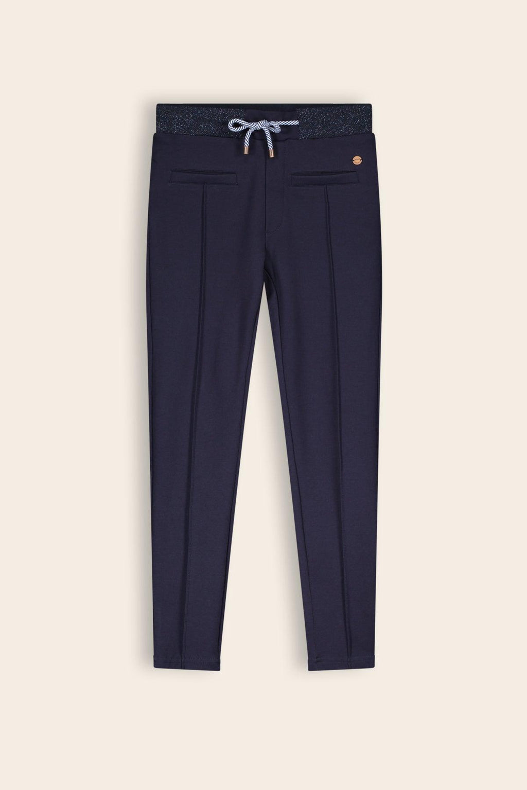 Slim fit sweat broek wat mooi aansluit en net wat netter is door de plooi op het voorbeen en lurex streep detail in de tailleband. Komt in rood en navy.