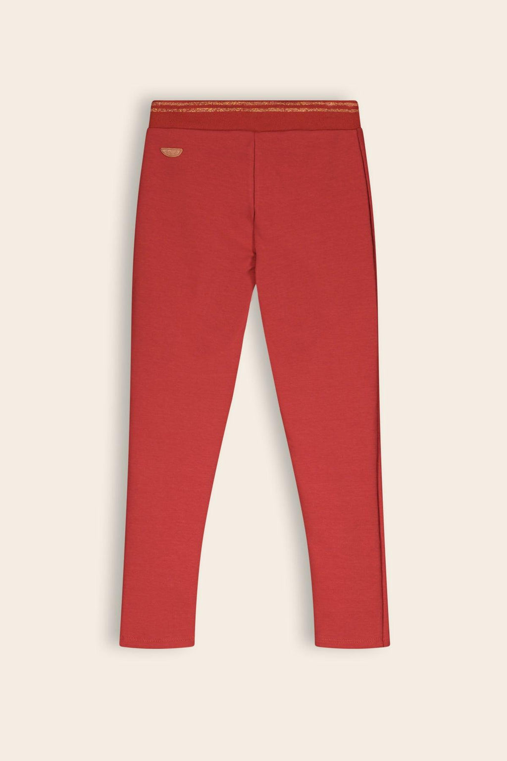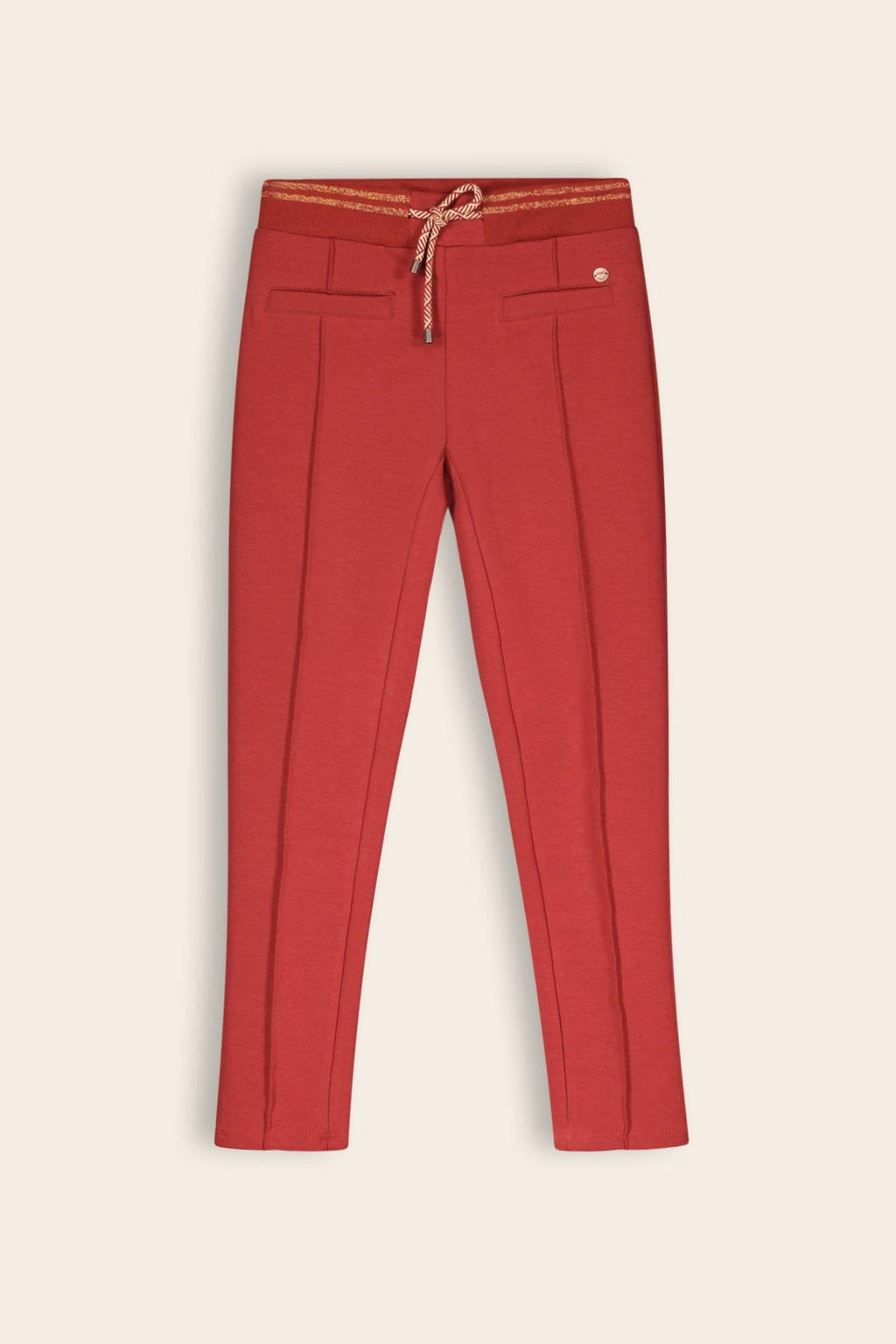 Slim fit sweat broek wat mooi aansluit en net wat netter is door de plooi op het voorbeen en lurex streep detail in de tailleband. Komt in rood en navy.
