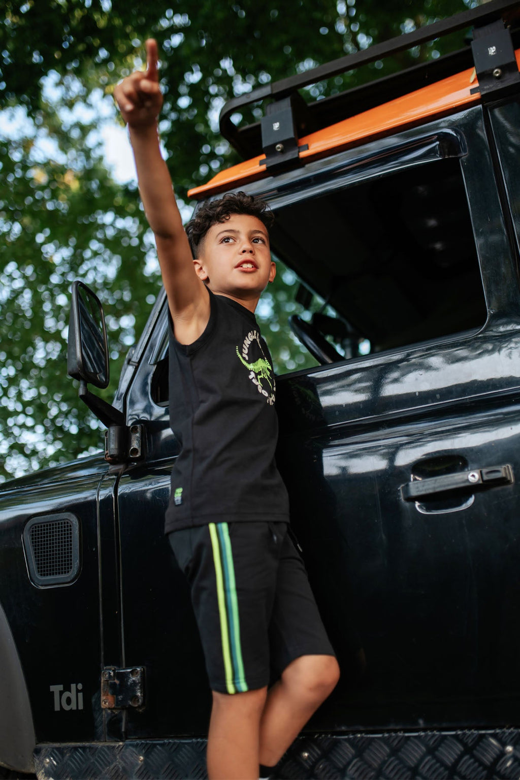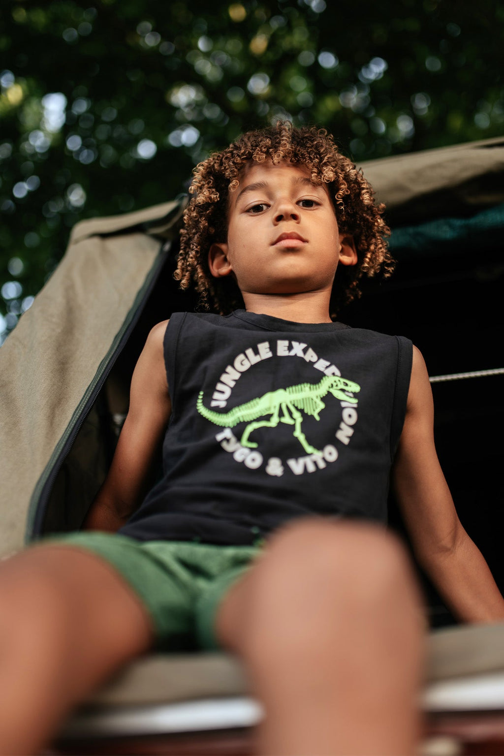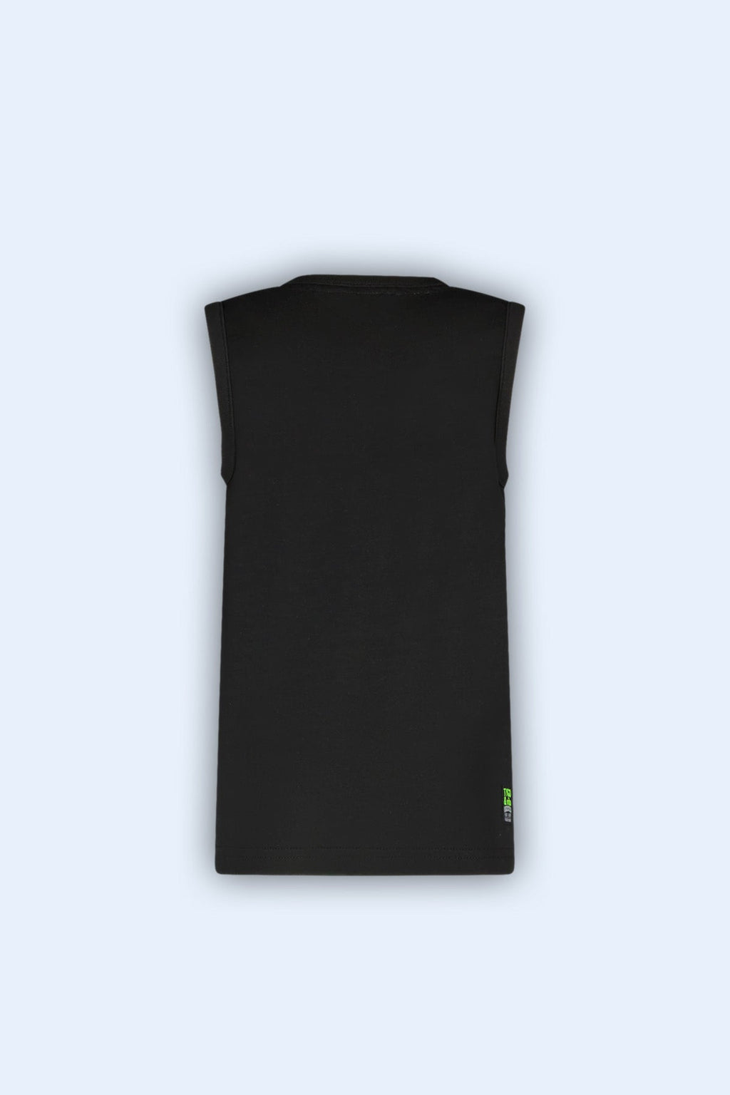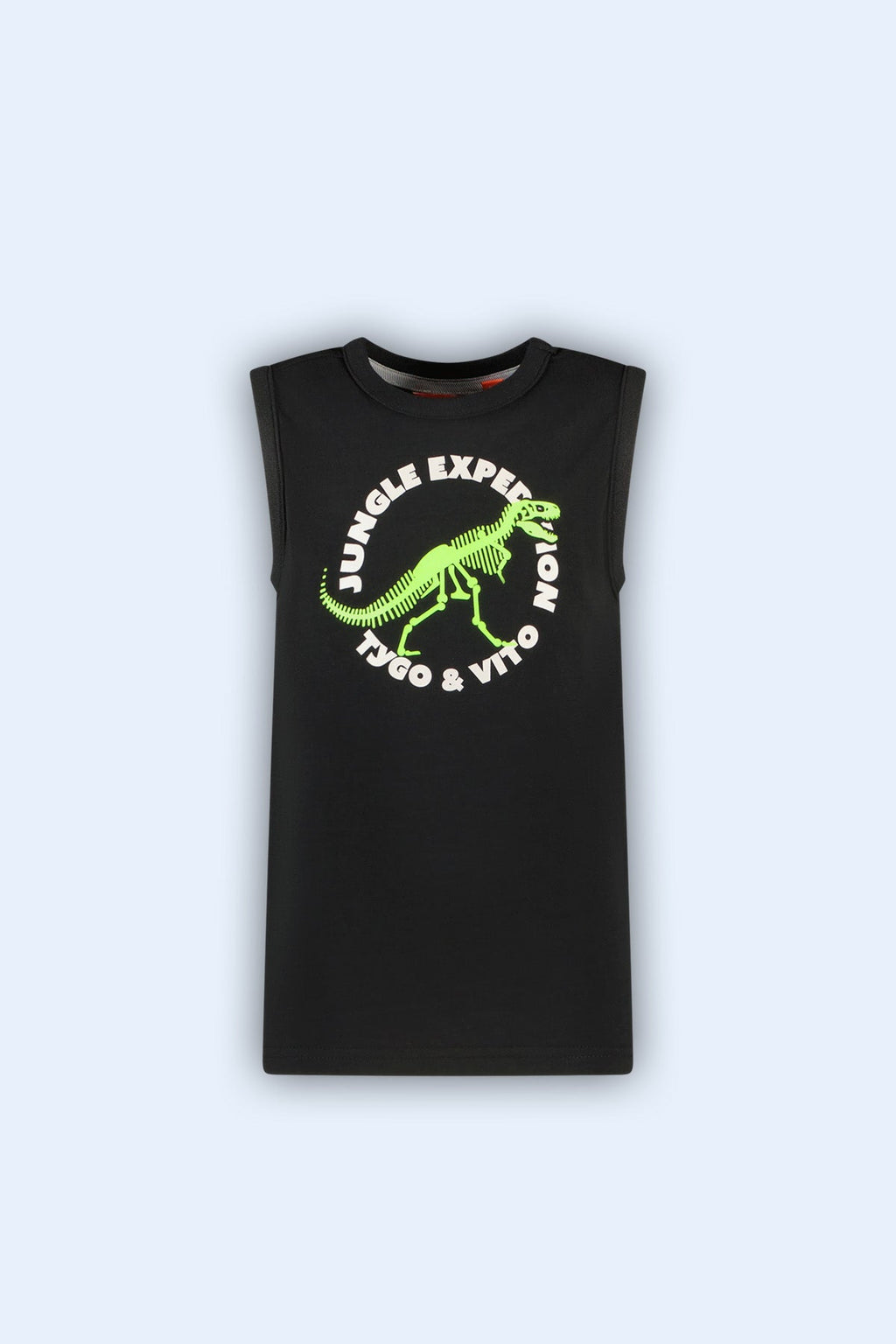Zwarte singlet 'Daan', met een stoere en vrolijke groene print op de borst. Dit trendy en comfortabele singlet van TYGO & vito voegt flair toe aan je zomerlook. Een modieuze keuze voor warme dagen en een stijlvolle aanvulling op je zomergarderobe. Gemaakt van comfortabel biologisch katoen, FOR A BETTER NEXTERDAY. Wist je trouwens dat je door het scannen van de QR-code de reis kunt zien die dit kledingstuk al heeft afgelegd? Verkrijgbaar in de maten 92-152.