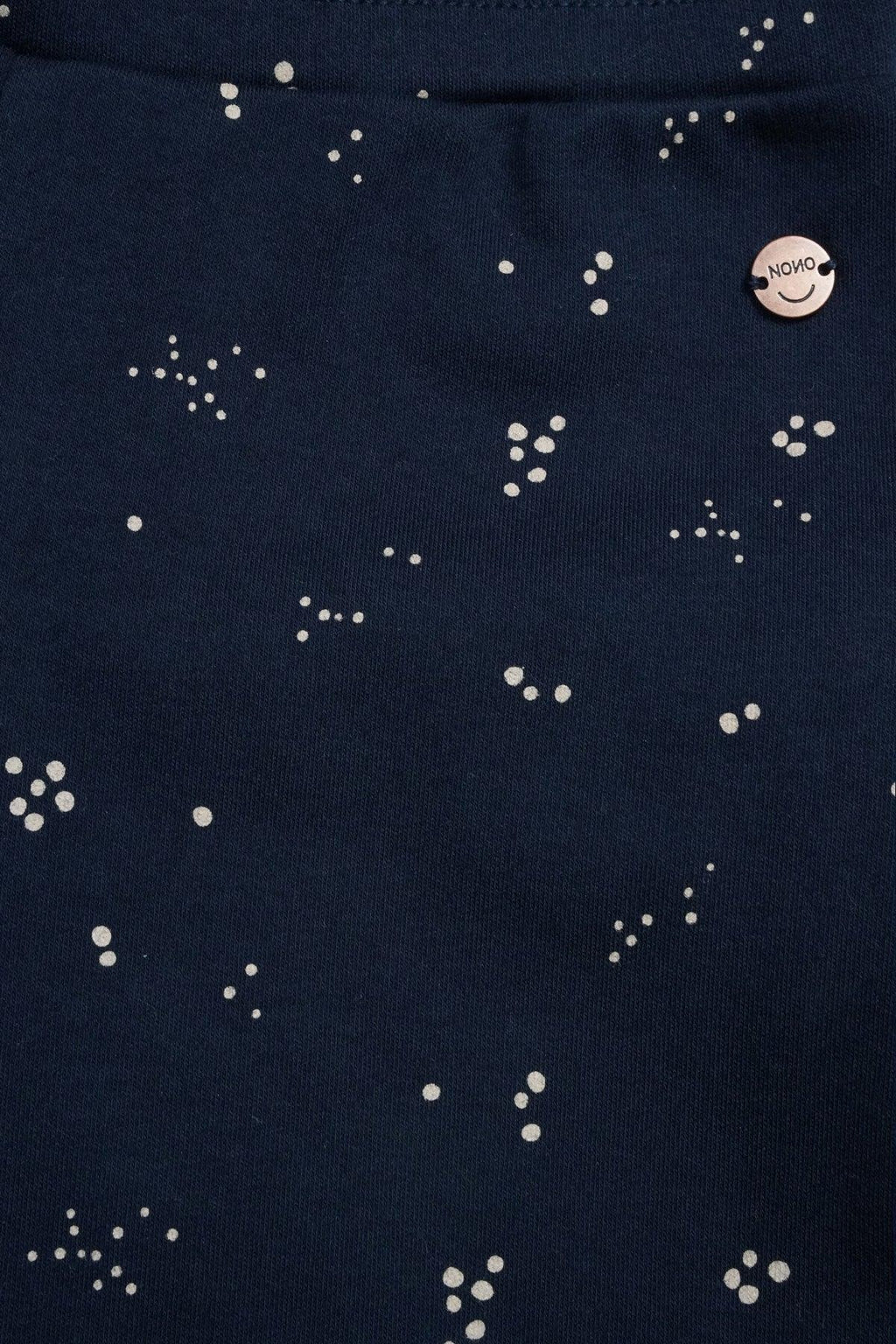 Navy flared broek met een twist door de speels beige stippen print. De broek is gemaakt van een wat zwaardere jersey voor de koude winterdagen.