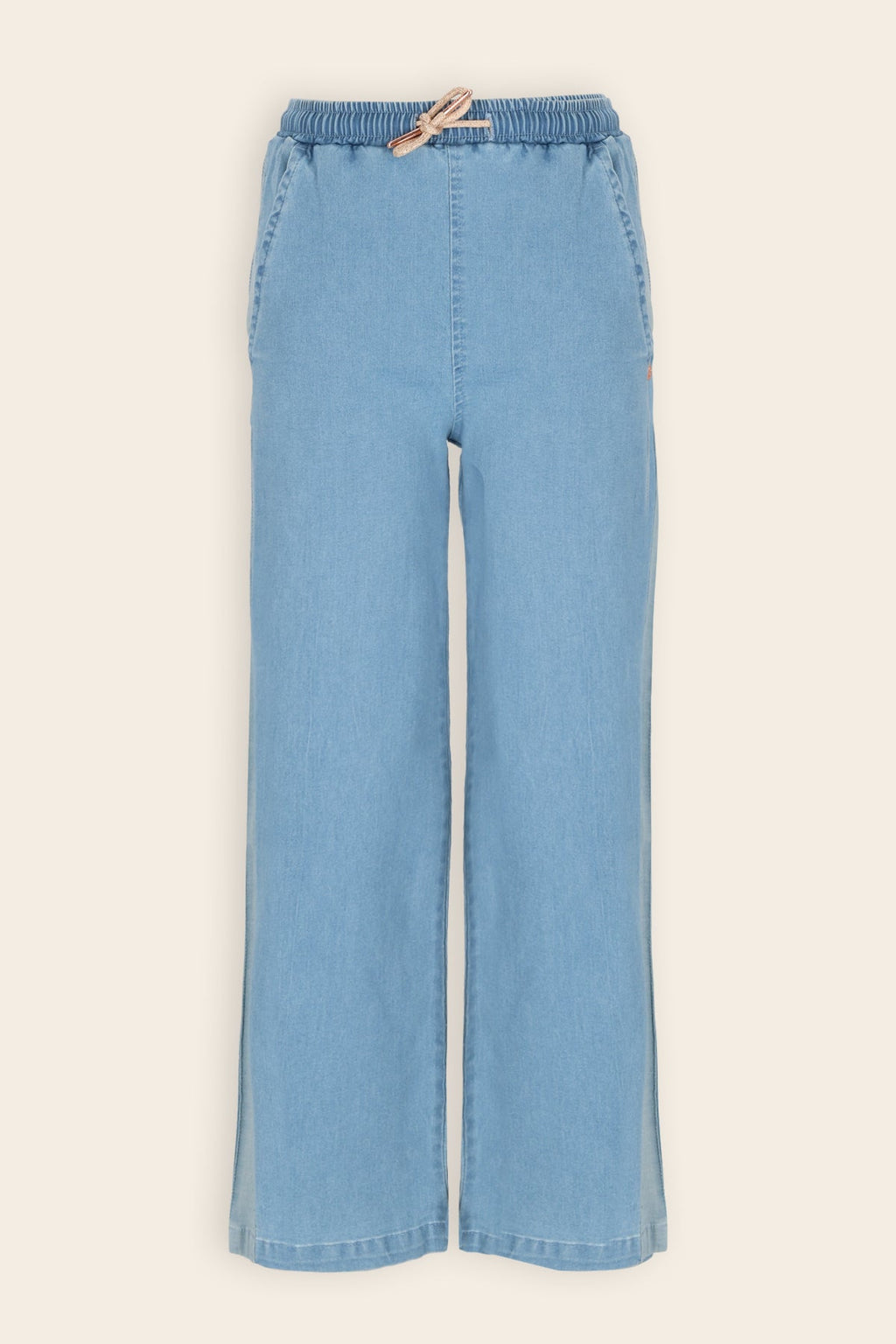 zachte stretch denim broek met wijde pijpen. Contrast denim stroken op de zijnaad. In de tailleband zit een koord om aan te snoeren.