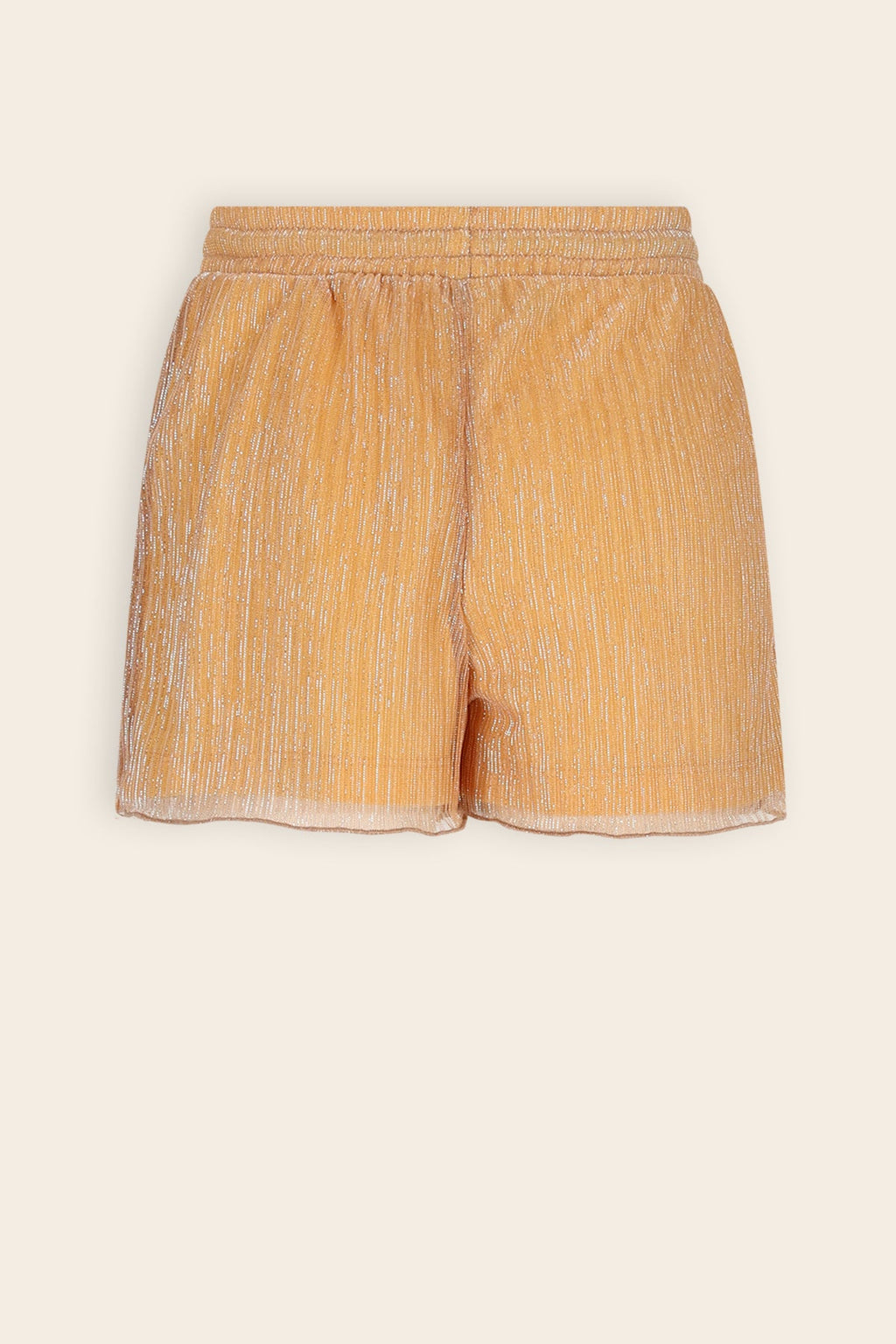 plissee short met een glansdraadje. Gevlochten koordje in de taille om aan te snoeren. Gevoerd met een zachte jersey broekje