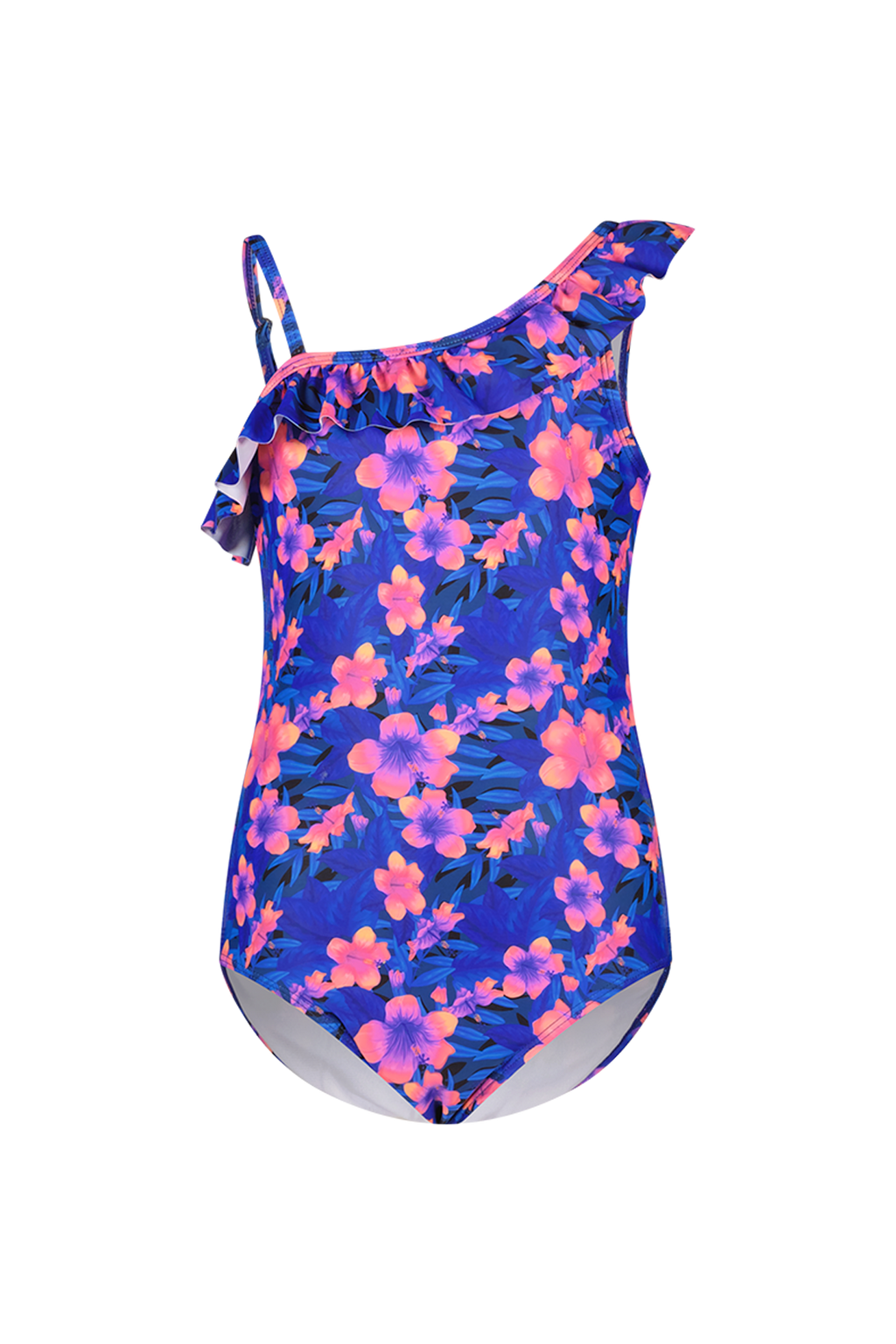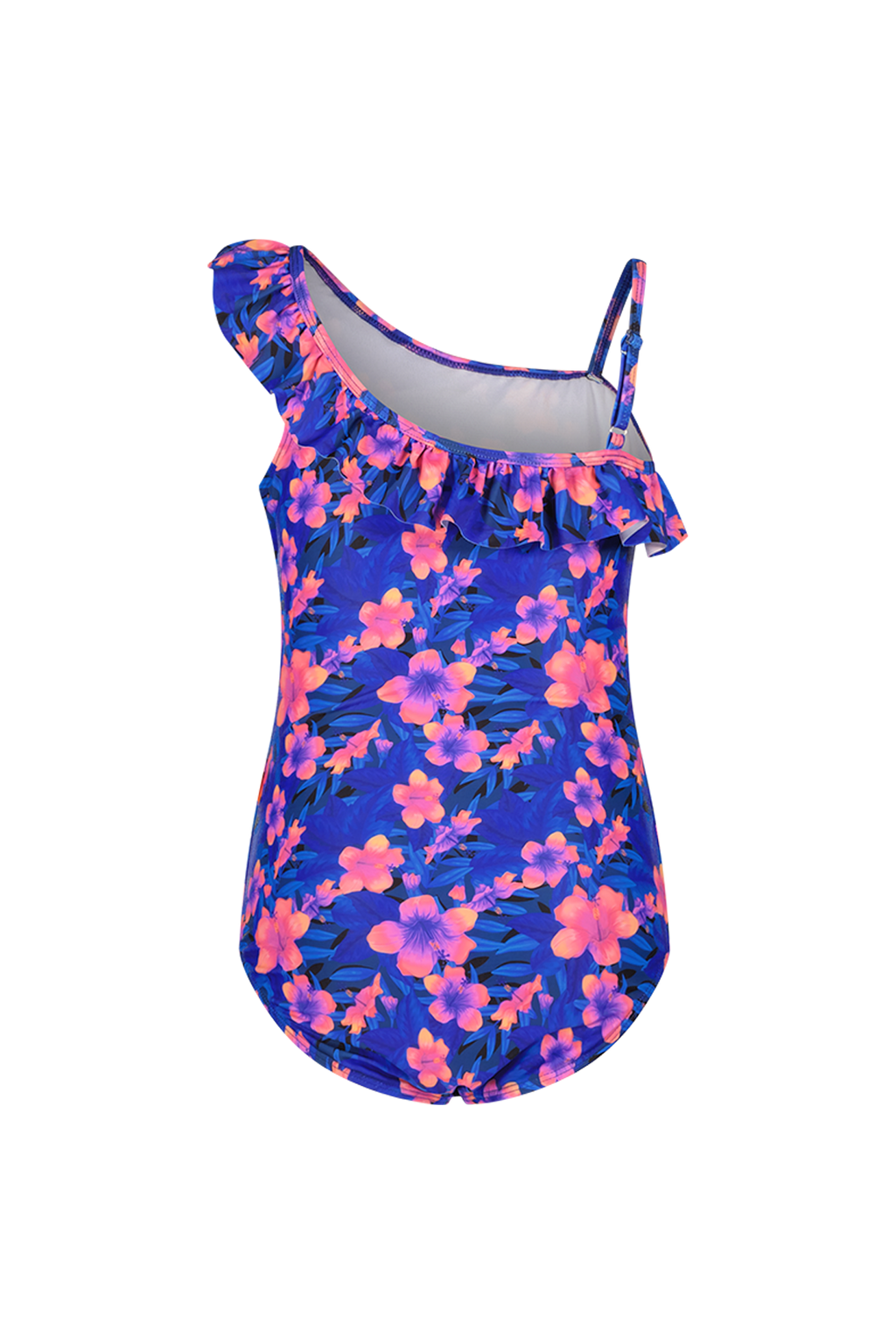 Dit sunset badpak heeft een one-shoulder look met ruches. Het heeft een klein, verstelbaar bandje op de rechterschouder, om het comfort van dit badpak te garanderen. Het badpak heeft geen sluiting. De bloemen print heeft prachtige bladeren en felle bloemen. Dit badpak geeft je een echt tropisch gevoel. Let op dit badpak valt smal, bij twijfel raden we je aan een maatje groter te bestellen. Onze badpakken en bikini's zijn gemaakt van gerecycled polyester. Beter voor de planeet! Volg de reis die je zwemkleding heeft afgelegd door de QR-code op de hangtag te scannen. Daarnaast hebben onze badpakken en bikini's een speciale uv-protection behandeling gehad. Extra veilig voor de zonnige dagen.