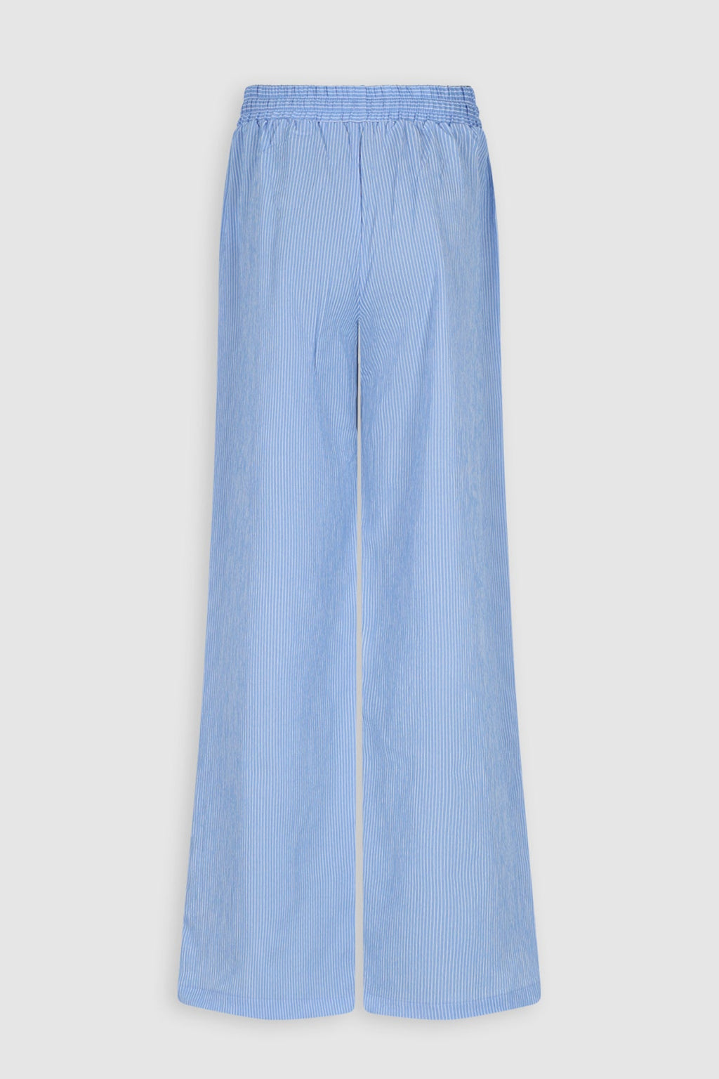 Susan Gestreepte Broek Blauw, een luchtige zomerbroek voor tienermeiden die hun garderobe een trendy boost willen geven. Deze broek met wijde pijpen en een subtiel krijtstreepje is perfect voor een casual of stijlvolle look. Ervaar het comfort en de unieke vibe van Nobell'.