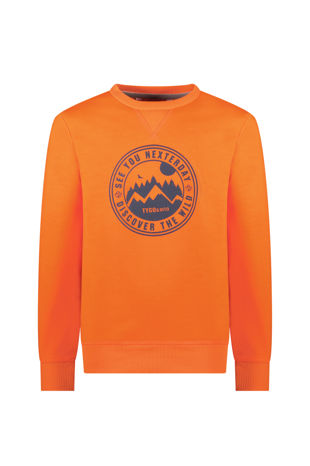 Discover the wild in deze stoere neon oranje sweater in zachte kwaliteit met ronde hals. De trui heeft een donkerblauwe print op de voorkant en is makkelijk te combineren met de TYGO & vito jeans en andere fancy broeken uit deze levering. Als je voor deze sweater kiest, steun je het "Cotton made in Africa" initiatief. TYGO & vito FOR A BETTER NEXTERDAY. Verkrijgbaar in de maten 92-152.