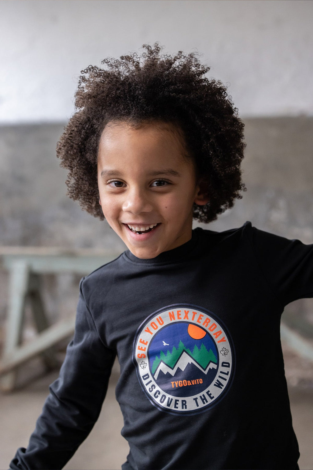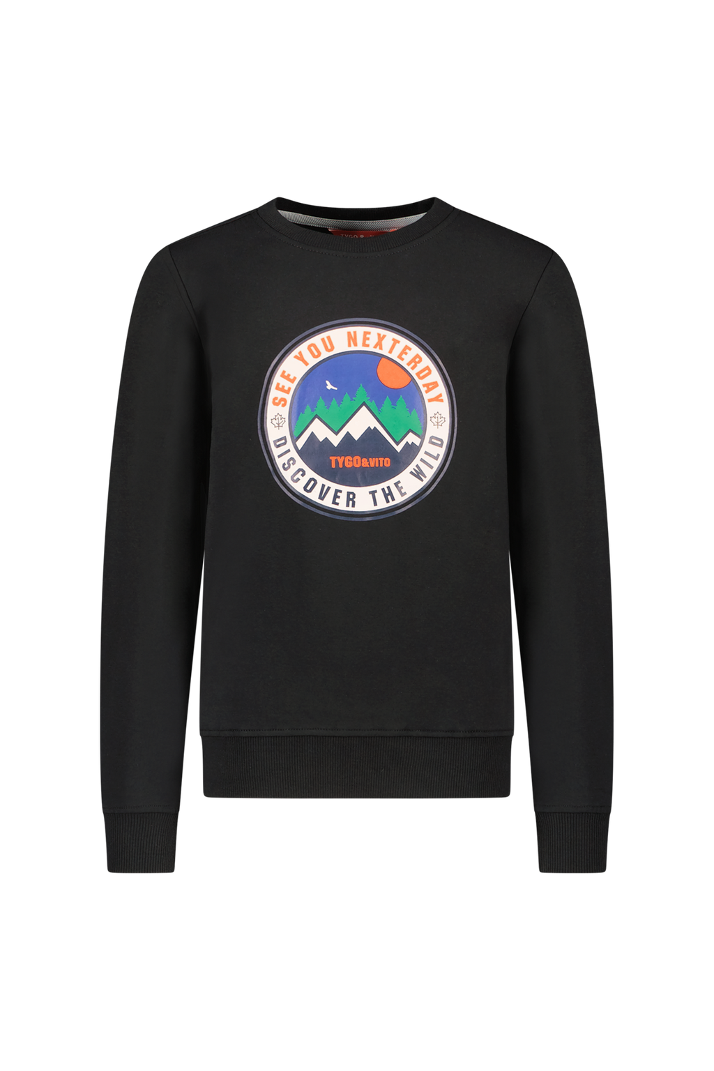Discover the wild in deze stoere zwarte sweater in elastisch katoen met ronde hals. De trui heeft een kleurrijke print op de voorkant en is makkelijk te combineren met de TYGO & vito jeans en andere fancy broeken uit deze levering. Als je voor deze sweater kiest, steun je het "Cotton made in Africa" initiatief. TYGO & vito FOR A BETTER NEXTERDAY. Verkrijgbaar in de maten 92-152. SEE YOU NEXTERDAY.