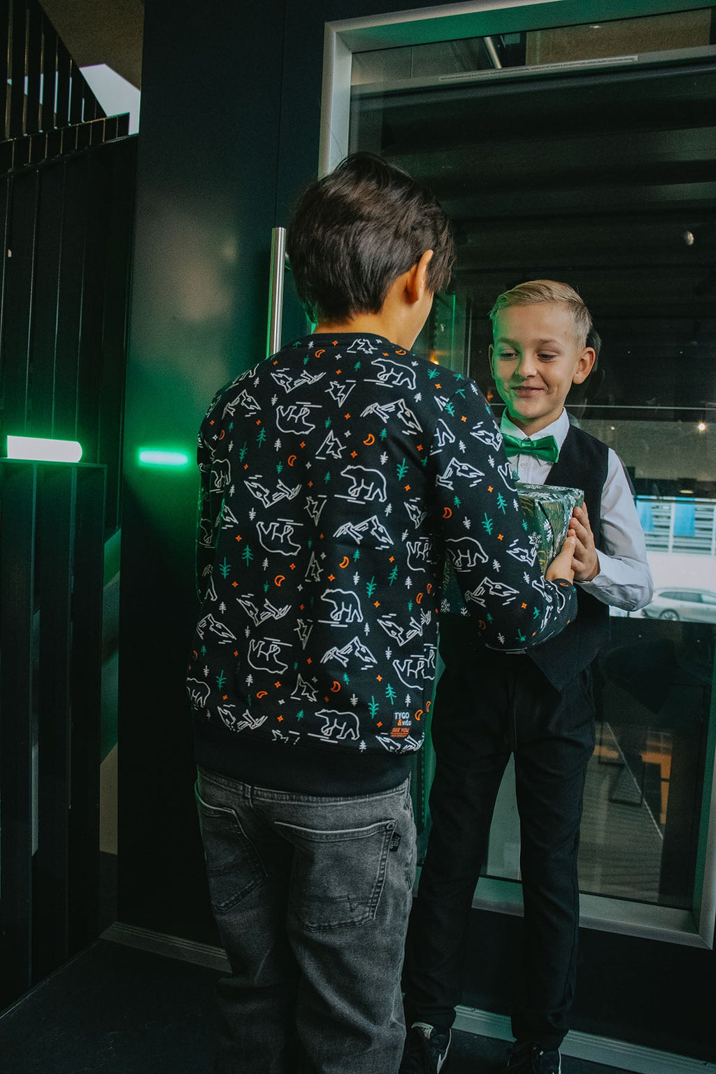 Deze “foute kersttrui” valt op met een leuke all-over print. Gemaakt van een comfortabele stretchkwaliteit die warm en zacht aanvoelt, vervaardigd uit 100% biologisch katoen met GOTS-certificaat. Scan de QR-code en ontdek het verhaal achter dit kledingstuk. Verkrijgbaar in maten 92 t/m 152.