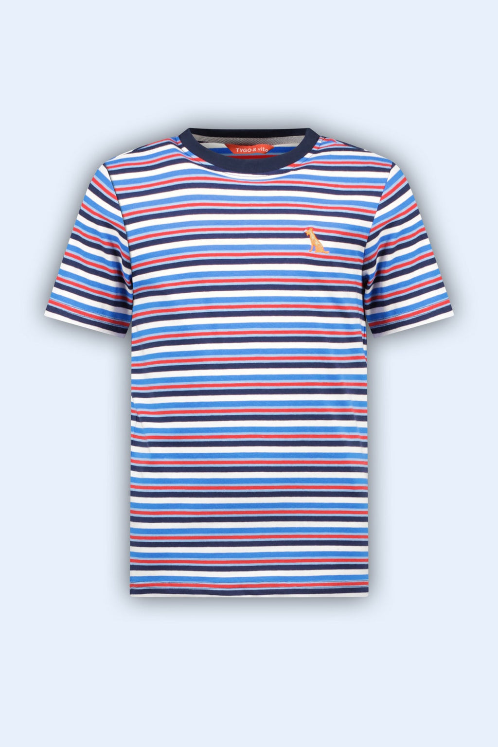 T-shirt 'Jack' met een all-over streepjesprint in vrolijke zomerse kleuren. Op de borst bevindt zich een TYGO & vito logo. Gemaakt van biologisch katoen FOR A BETTER NEXTERDAY. Verkrijgbaar in de maten 92-152. Een stijlvolle en duurzame keuze om je zomergarderobe op te fleuren. Wist je trouwens dat je door het scannen van de QR-code de reis kunt zien die dit kledingstuk al heeft afgelegd?