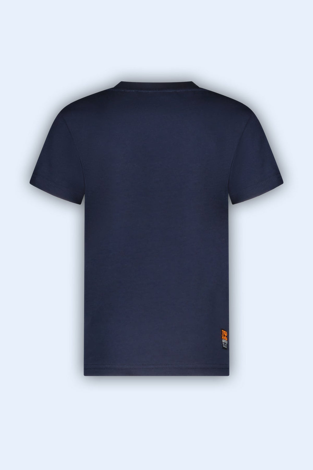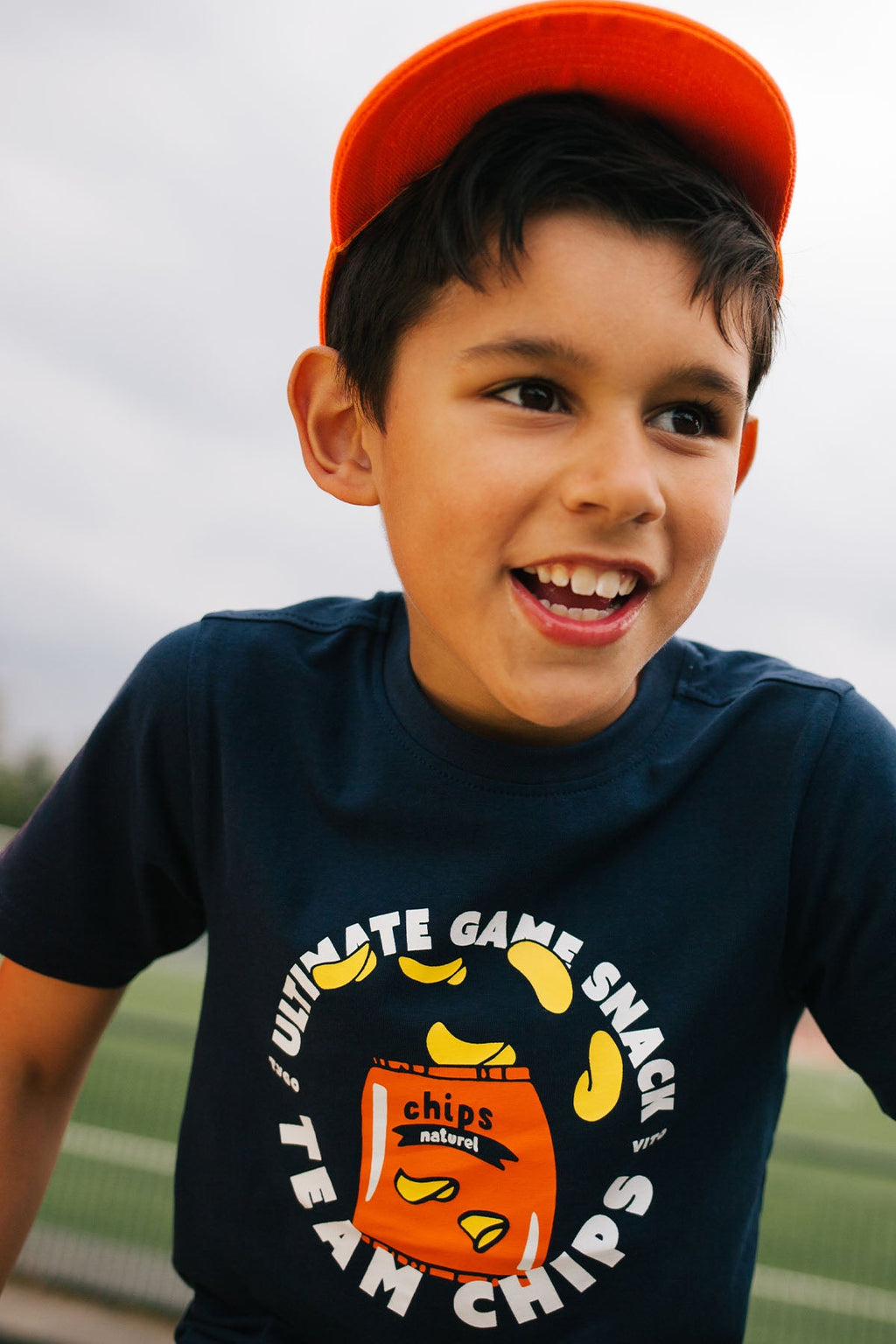 TEAM CHIPS! T-shirt 'Jaimy' in donker blauwe kleur met een levendige gekleurde print op de borst. Gemaakt van comfortabel biologisch katoen.Dit T-shirt is niet alleen stijlvol, maar ook een duurzame keuze FOR A BETTER NEXTERDAY. Wist je trouwens dat je door het scannen van de QR-code de reis kunt zien die dit kledingstuk al heeft afgelegd? Verkrijgbaar in de maten 92-152.