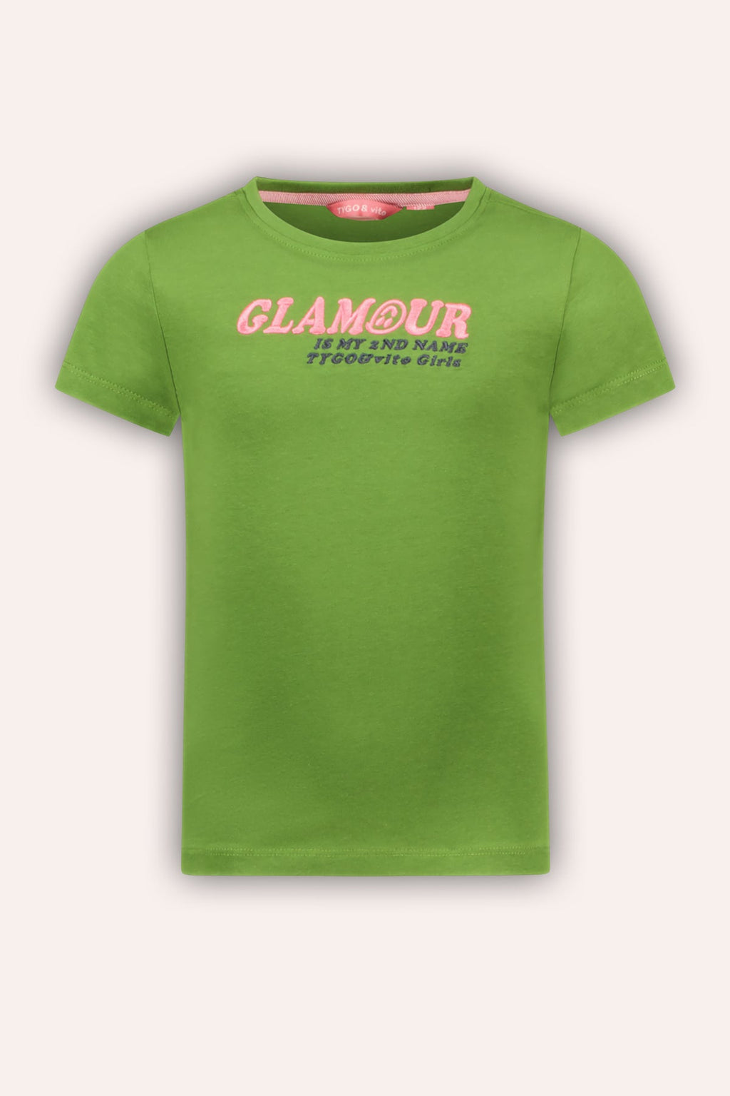Stijlvol groen T-shirt 'Jill' met de opdruk "Glamour is my second name" op de borst. Draag het met flair en duurzaamheid, gemakkelijk te combineren met jeans of shorts. Een modieuze en milieubewuste keuze van TYGO & vito, bijdragend aan FOR A BETTER NEXTERDAY. Wist je trouwens dat je door het scannen van de QR-code de reis kunt zien die dit kledingstuk al heeft afgelegd? Verkrijgbaar in de maten 92-152.
