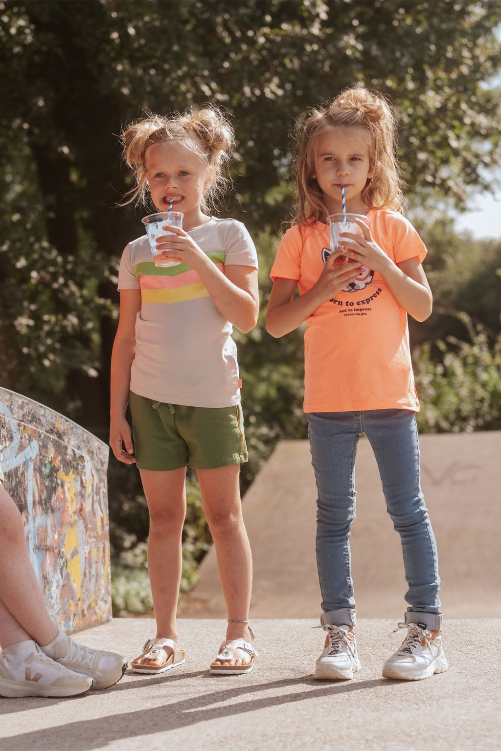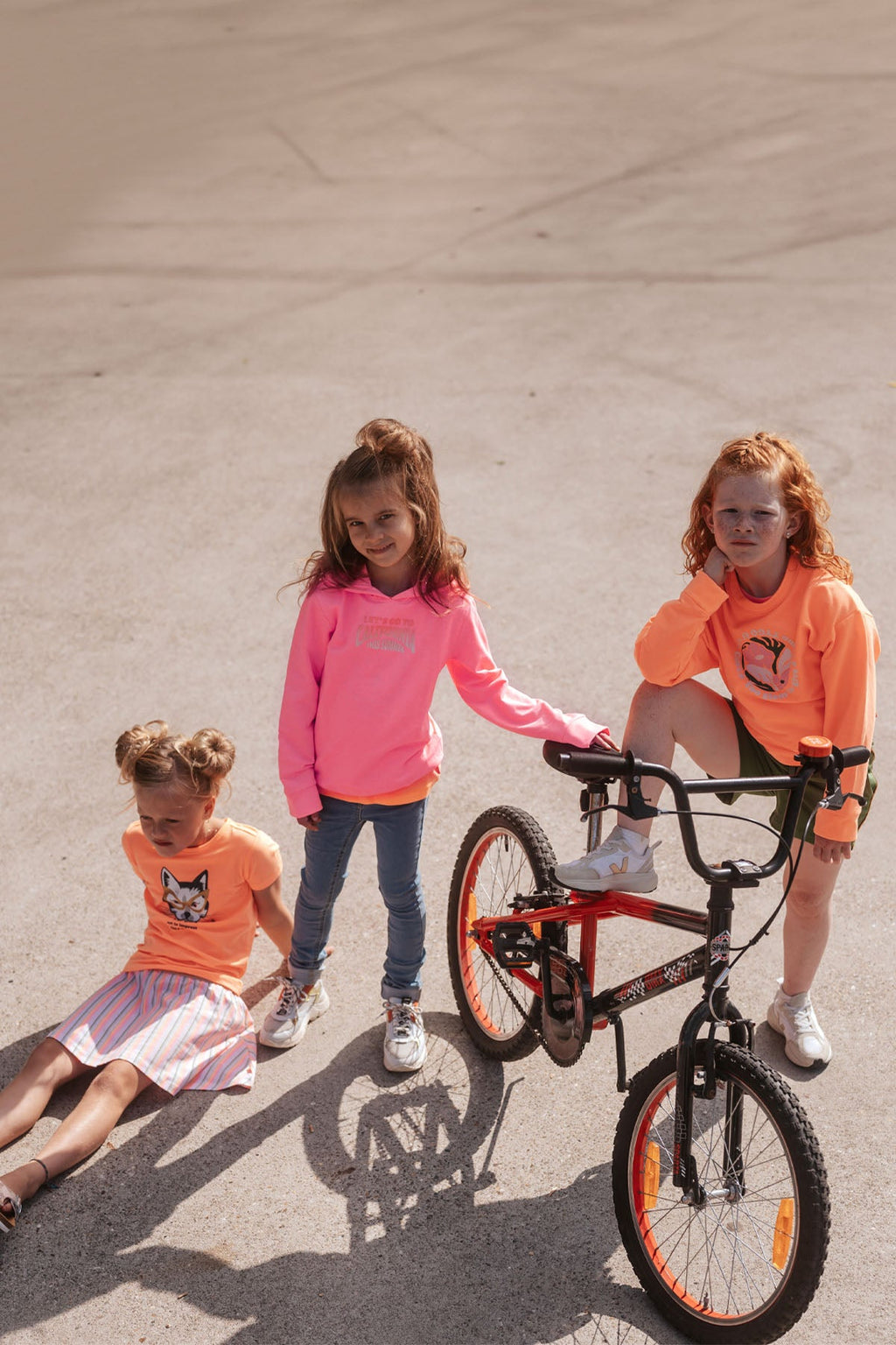 Stijlvol neonkoraal T-shirt 'Jill' met biologisch katoen met een stoere print op de borst. Trendy en duurzaam, draag het moeiteloos met jeans of shorts voor een frisse vibe. Een kleurrijke en milieubewuste keuze van TYGO & vito, bijdragend aan FOR A BETTER NEXTERDAY. Wist je trouwens dat je door het scannen van de QR-code de reis kunt zien die dit kledingstuk al heeft afgelegd? Verkrijgbaar in de maten 92-152.