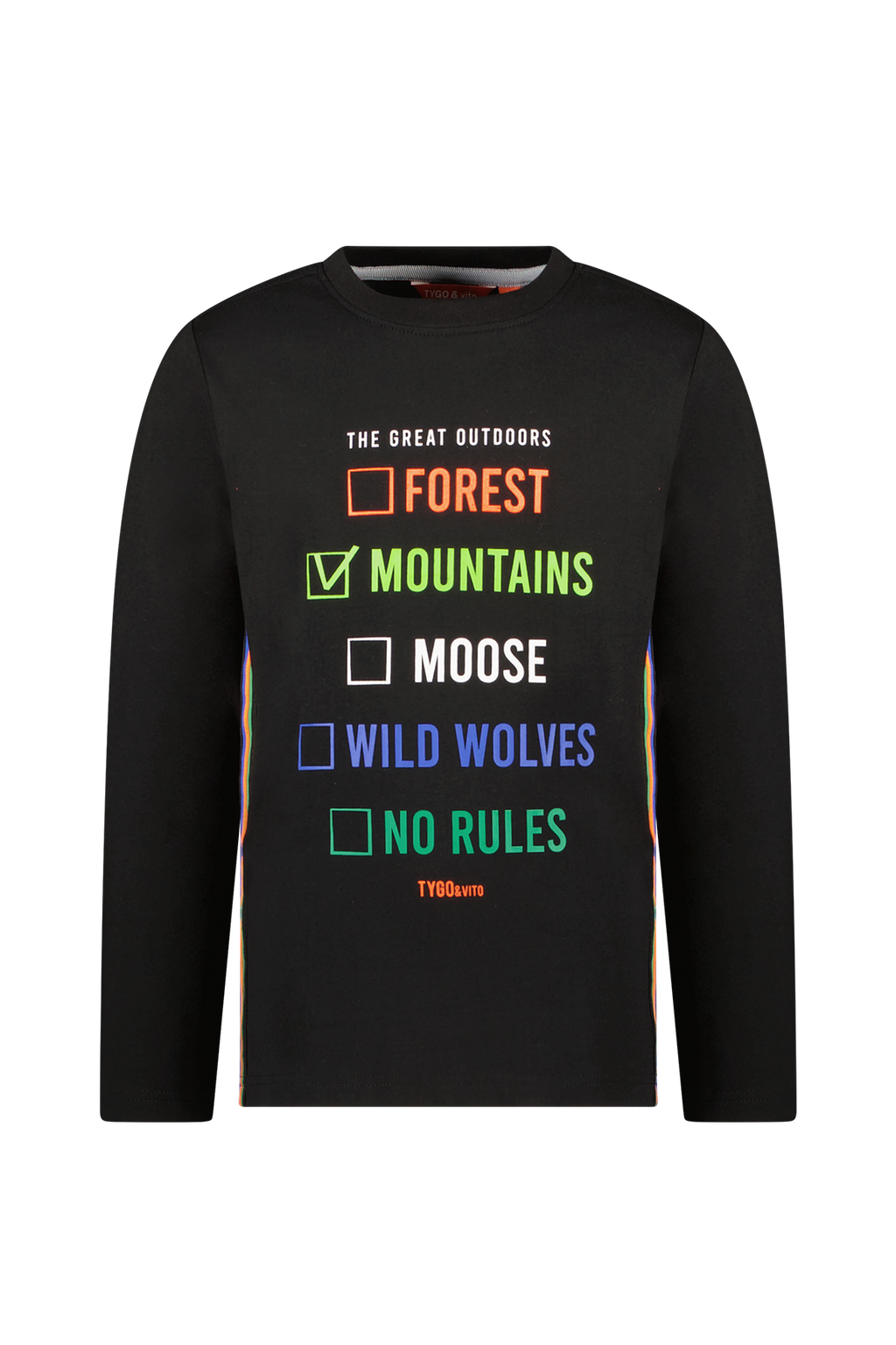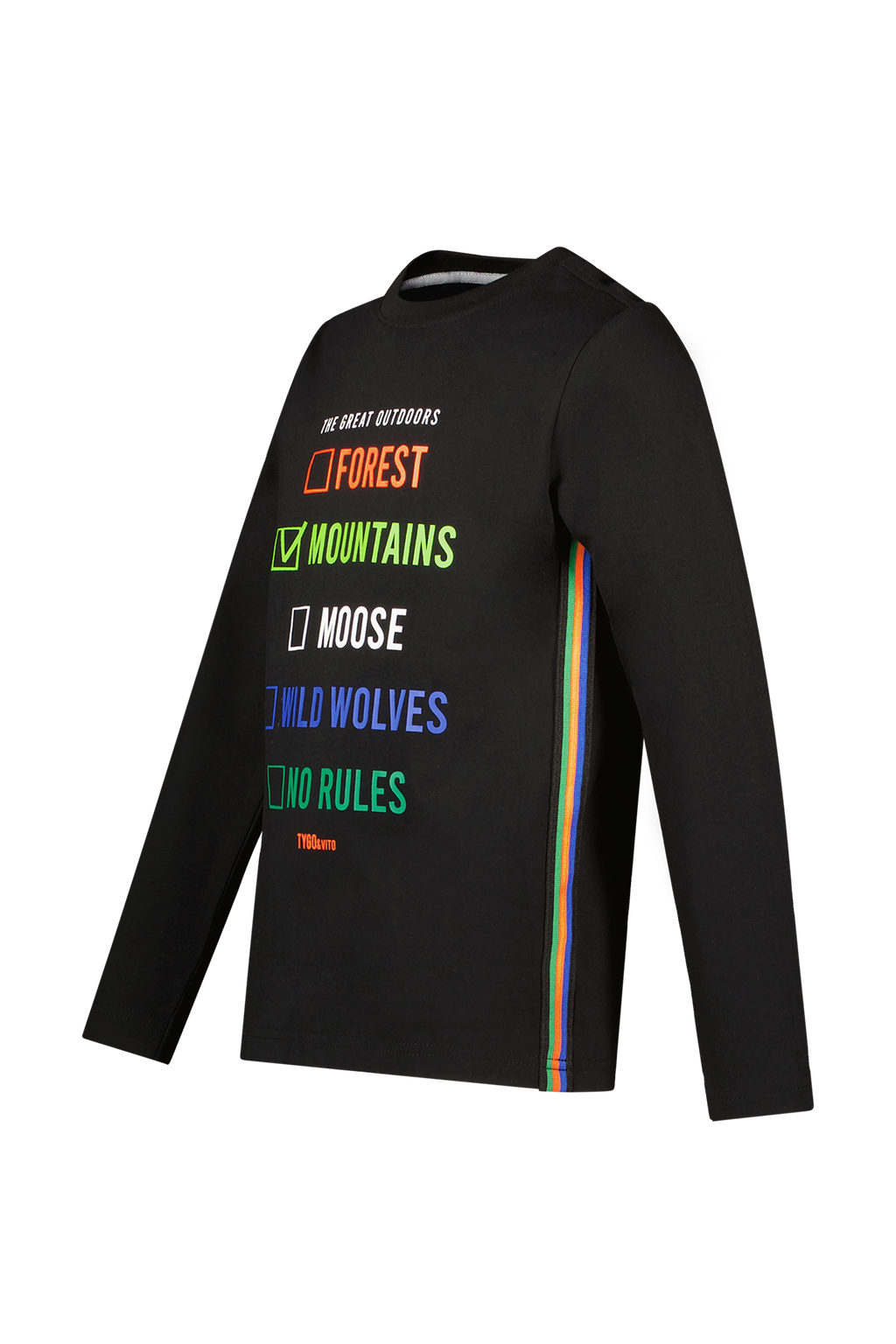 Waar ga jij op avontuur in dit zwarte T-shirt lange mouw van het merk TYGO & vito? Het T-shirt is gemaakt van elastisch katoen en makkelijk te combineren met de TYGO & vito jeans en andere fancy broeken uit deze levering. Als je voor deze longsleeve kiest, steun je het "Cotton made in Africa" initiatief. TYGO & vito FOR A BETTER NEXTERDAY. Verkrijgbaar in de maten 92-152.