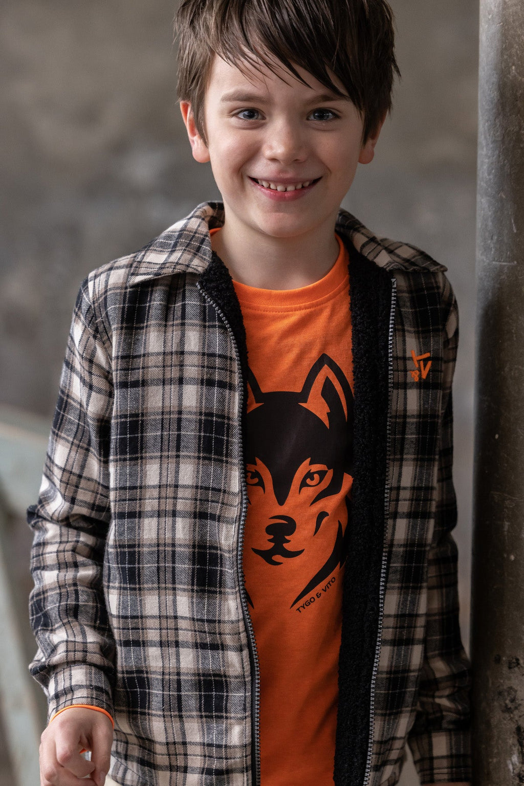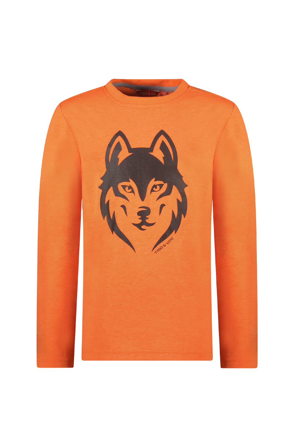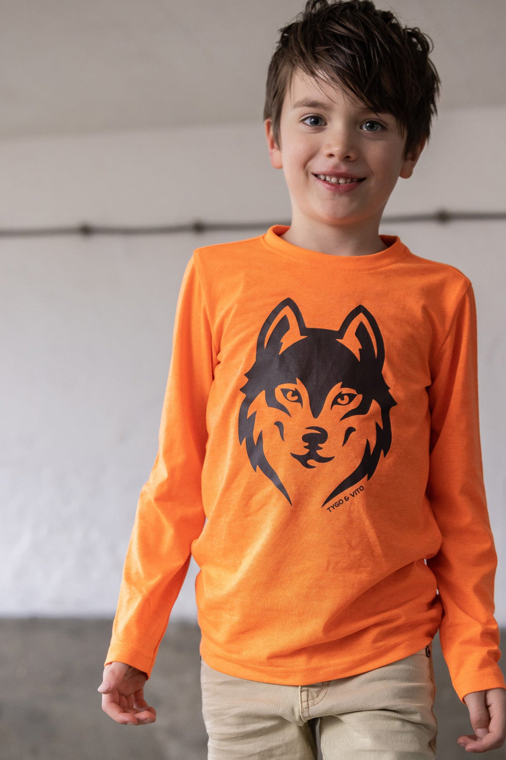 Oh, wow, hoe stoer is dit neon oranje T-shirt lange mouw van het merk TYGO & vito? Het T-shirt heeft een wolven print op de voorkant en is makkelijk te combineren met de TYGO & vito jeans en andere fancy broeken uit deze levering. Als je voor deze longsleeve kiest, steun je het "Cotton made in Africa" initiatief. TYGO & vito FOR A BETTER NEXTERDAY. Verkrijgbaar in de maten 92-152