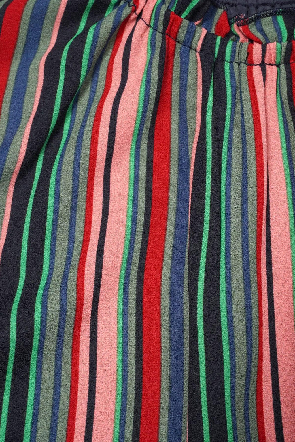 Heb je het plooi detail bij de mouwen al gezien? Dit blousje gemaakt van gerecycled polyester heeft een smockband bij de zoom en mouwen. Frisse strepen print die lekker te combineren is met groen, roze, rood en navy onderstukken uit onze winter collectie. Het blousje is gevoerd met een fijne dunne katoenen voering. Elastieken hals zonder lastige knoopjes! Makkelijk zelf aan te krijgen zonder hulp van mama.