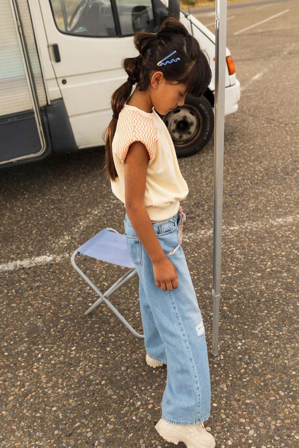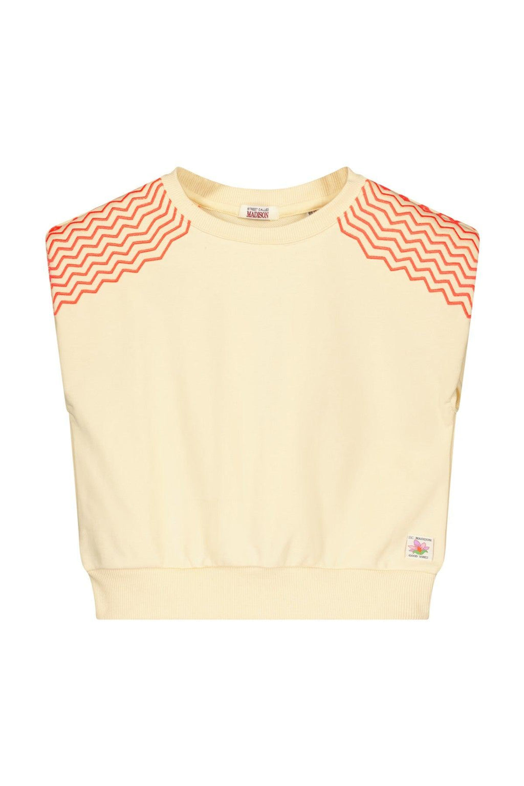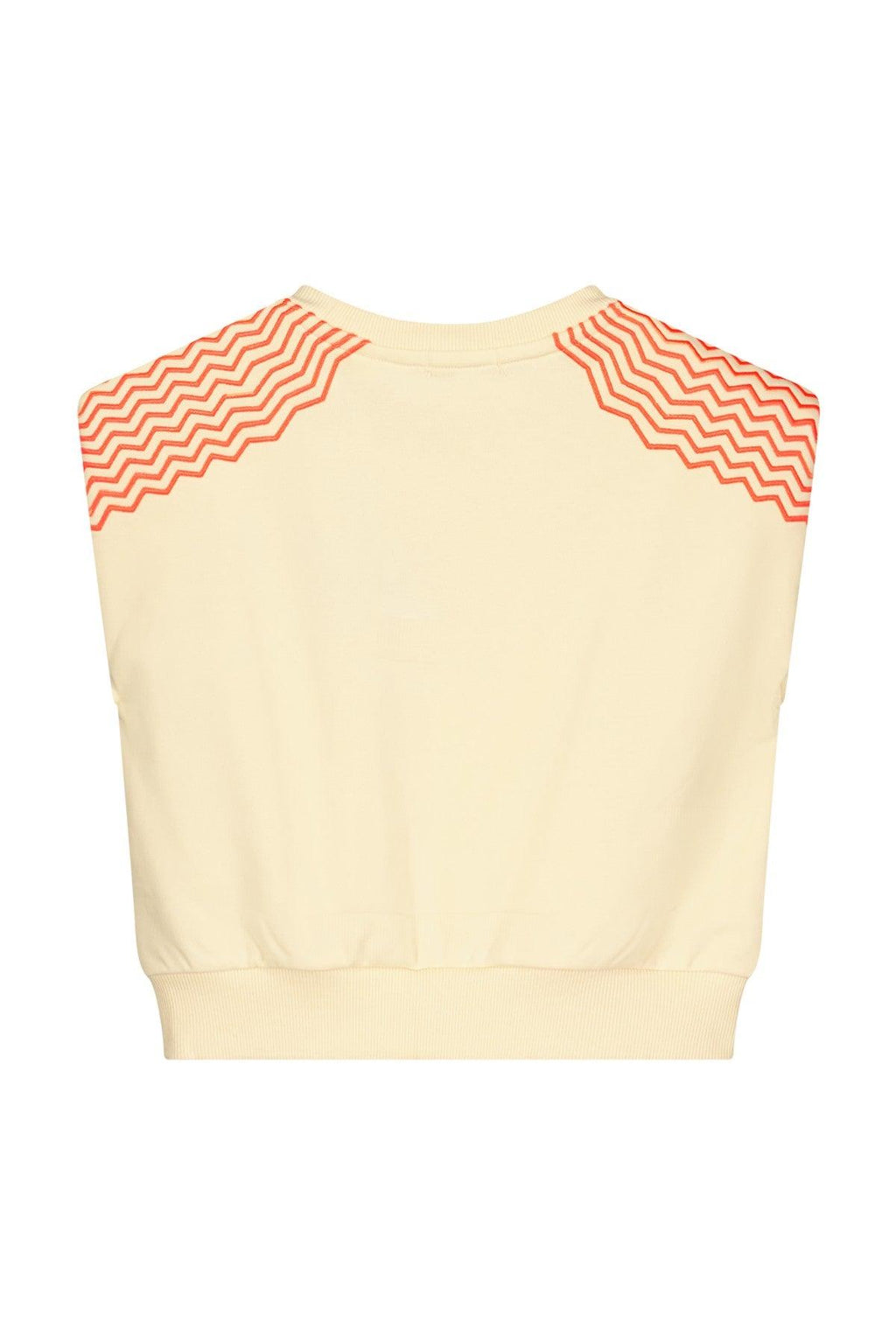 Luna shoulder padded sweater LUCA. Deze toffe off white sweater heeft schouder vullingen voor een mooi silhouette en een geborduurde neon zigzag over de schouders.